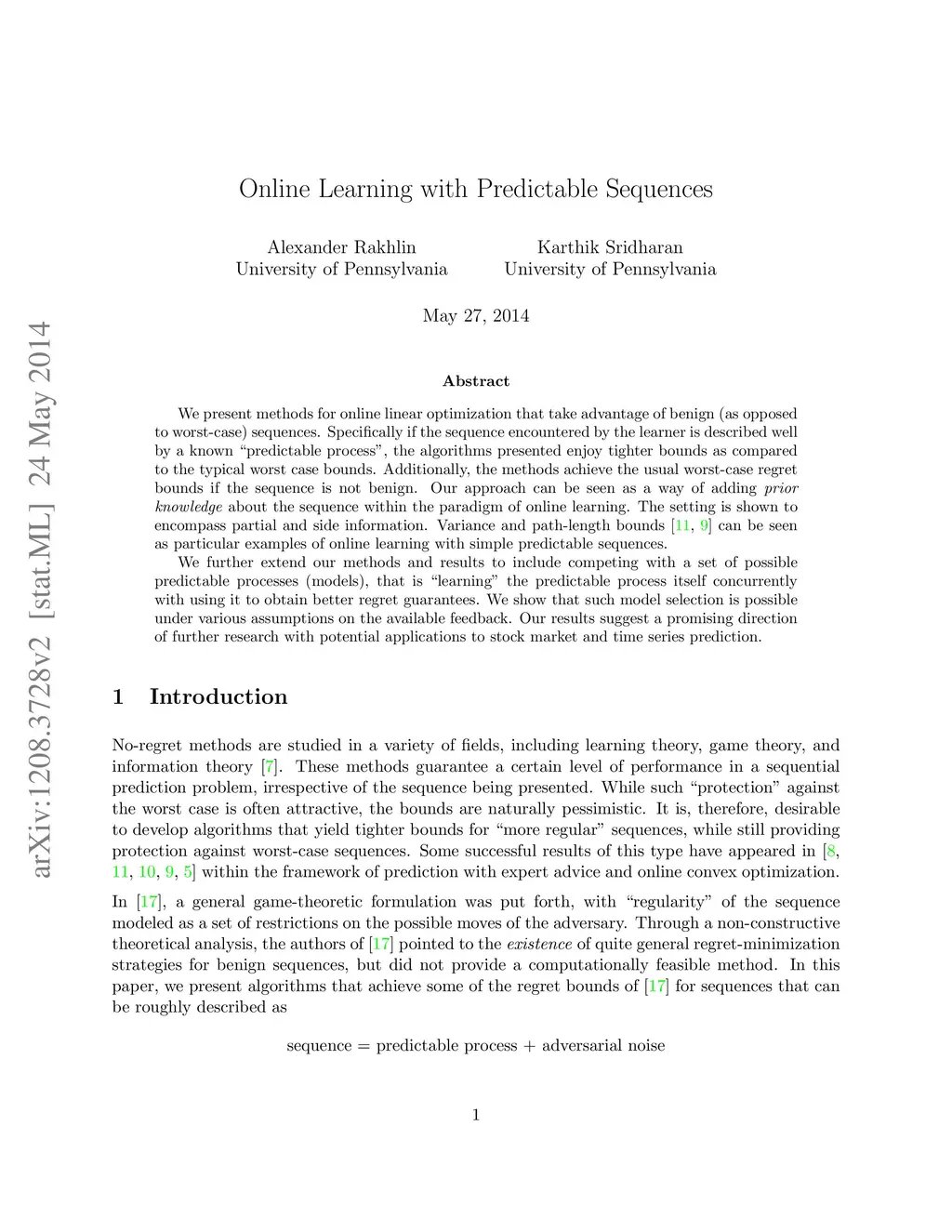 We present methods for online linear optimization that take advantage of benign (as opposed to worst-case) sequences. Specifically if the sequence encountered by the learner is described well by a known "predictable process", the algorithms presented enjoy tighter bounds as compared to the typical worst case bounds. Additionally, the methods achieve the usual worst-case regret bounds if the sequence is not benign. Our approach can be seen as a way of adding prior knowledge about the sequence within the paradigm of online learning. The setting is shown to encompass partial and side information. Variance and path-length bounds can be seen as particular examples of online learning with simple predictable sequences. We further extend our methods and results to include competing with a set of possible predictable processes (models), that is "learning" the predictable process itself concurrently with using it to obtain better regret guarantees. We show that such model selection is possible under various assumptions on the available feedback. Our results suggest a promising direction of further research with potential applications to stock market and time series prediction.