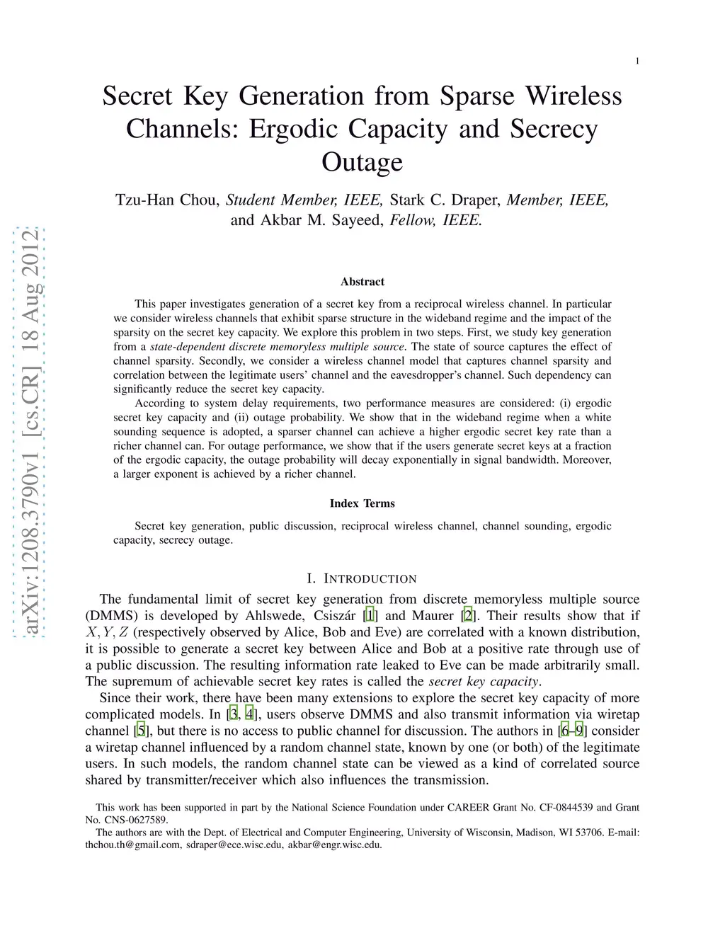 This paper investigates generation of a secret key from a reciprocal wireless channel. In particular we consider wireless channels that exhibit sparse structure in the wideband regime and the impact of the sparsity on the secret key capacity. We explore this problem in two steps. First, we study key generation from a state-dependent discrete memoryless multiple source. The state of source captures the effect of channel sparsity. Secondly, we consider a wireless channel model that captures channel sparsity and correlation between the legitimate users' channel and the eavesdropper's channel. Such dependency can significantly reduce the secret key capacity. According to system delay requirements, two performance measures are considered: (i) ergodic secret key capacity and (ii) outage probability. We show that in the wideband regime when a white sounding sequence is adopted, a sparser channel can achieve a higher ergodic secret key rate than a richer channel can. For outage performance, we show that if the users generate secret keys at a fraction of the ergodic capacity, the outage probability will decay exponentially in signal bandwidth. Moreover, a larger exponent is achieved by a richer channel.