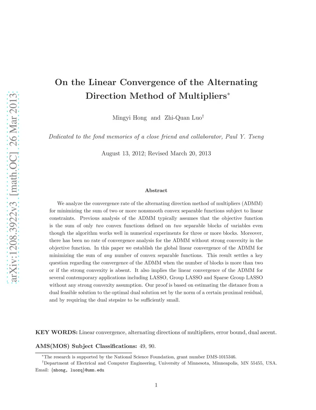 We analyze the convergence rate of the alternating direction method of multipliers (ADMM) for minimizing the sum of two or more nonsmooth convex separable functions subject to linear constraints. Previous analysis of the ADMM typically assumes that the objective function is the sum of only two convex functions defined on two separable blocks of variables even though the algorithm works well in numerical experiments for three or more blocks. Moreover, there has been no rate of convergence analysis for the ADMM without strong convexity in the objective function. In this paper we establish the global linear convergence of the ADMM for minimizing the sum of any number of convex separable functions. This result settles a key question regarding the convergence of the ADMM when the number of blocks is more than two or if the strong convexity is absent. It also implies the linear convergence of the ADMM for several contemporary applications including LASSO, Group LASSO and Sparse Group LASSO without any strong convexity assumption. Our proof is based on estimating the distance from a dual feasible solution to the optimal dual solution set by the norm of a certain proximal residual, and by requiring the dual stepsize to be sufficiently small.