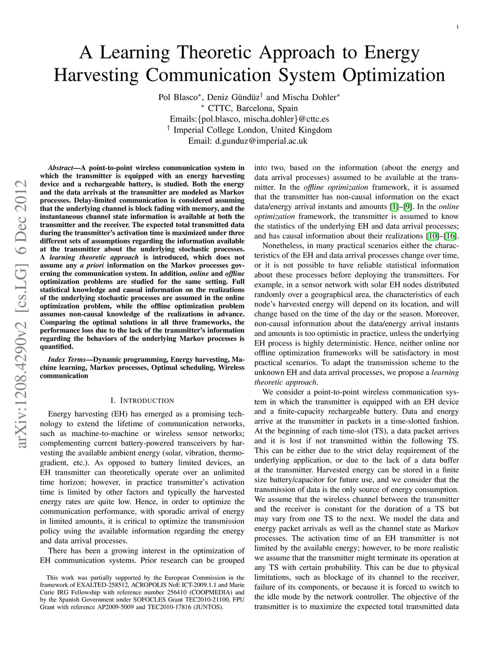 A Learning Theoretic Approach to Energy Harvesting Communication System