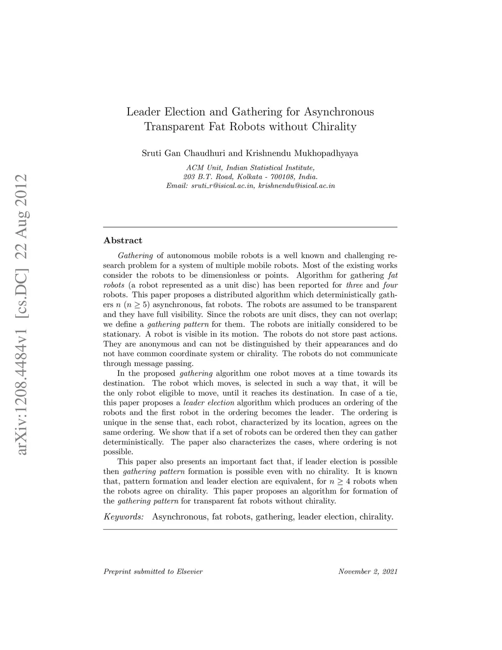 This paper proposes a distributed algorithm which deterministically gathers n (n > 4) asynchronous, fat robots. The robots are assumed to be transparent and they have full visibility. The robots are initially considered to be stationary. A robot is visible in its motion. The robots do not store past actions. They are anonymous and can not be distinguished by their appearances and do not have common coordinate system or chirality. The robots do not communicate through message passing. In the proposed gathering algorithm one robot moves at a time towards its destination. The robot which moves, is selected in such a way that, it will be the only robot eligible to move, until it reaches its destination. In case of a tie, this paper proposes a leader election algorithm which produces an ordering of the robots and the first robot in the ordering becomes the leader. The ordering is unique in the sense that, each robot, characterized by its location, agrees on the same ordering. We show that if a set of robots can be ordered then they can gather deterministically. The paper also characterizes the cases, where ordering is not possible. This paper also presents an important fact that, if leader election is possible then gathering pattern formation is possible even with no chirality.