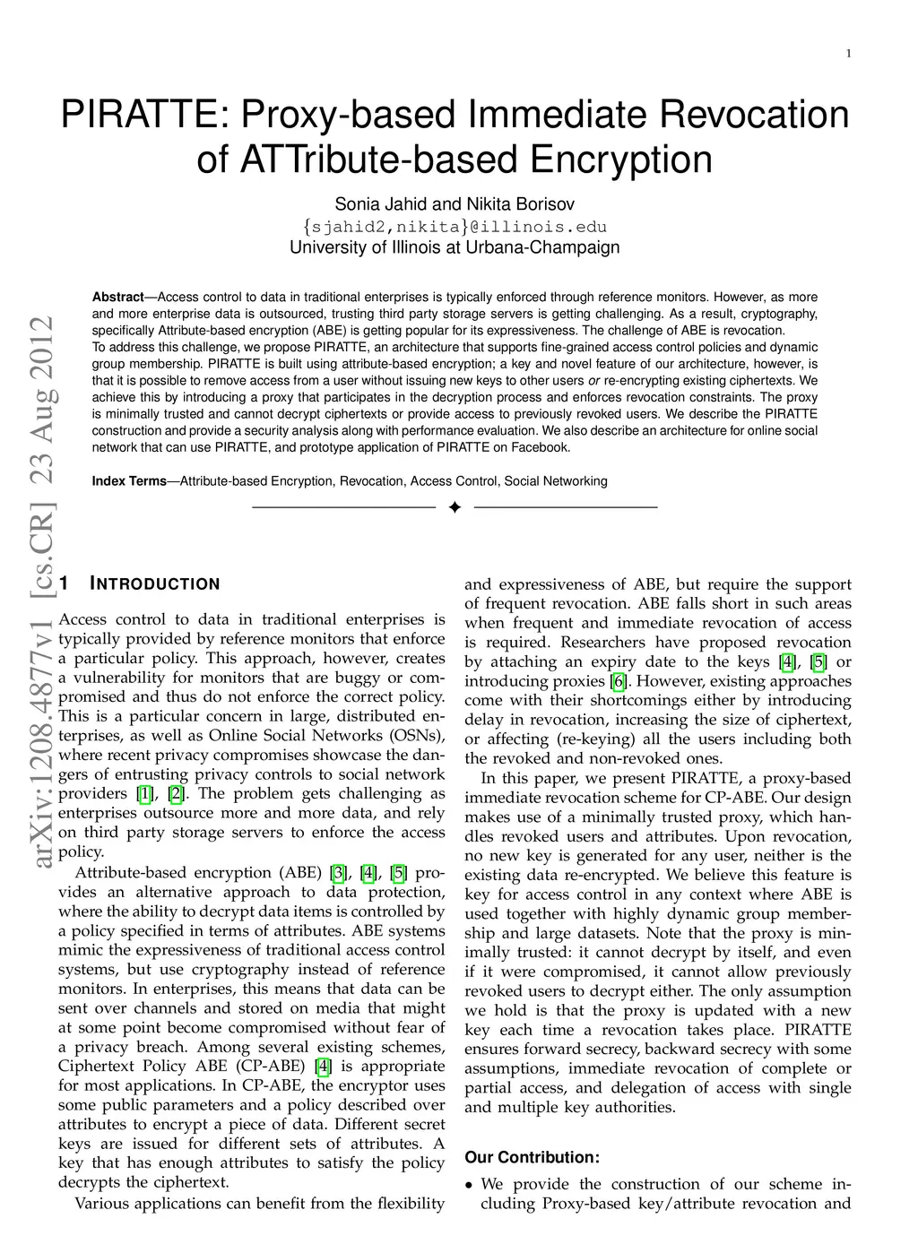 Access control to data in traditional enterprises is typically enforced through reference monitors. However, as more and more enterprise data is outsourced, trusting third party storage servers is getting challenging. As a result, cryptography, specifically Attribute-based encryption (ABE) is getting popular for its expressiveness. The challenge of ABE is revocation. To address this challenge, we propose PIRATTE, an architecture that supports fine-grained access control policies and dynamic group membership. PIRATTE is built using attribute-based encryption; a key and novel feature of our architecture, however, is that it is possible to remove access from a user without issuing new keys to other users or re-encrypting existing ciphertexts. We achieve this by introducing a proxy that participates in the decryption process and enforces revocation constraints. The proxy is minimally trusted and cannot decrypt ciphertexts or provide access to previously revoked users. We describe the PIRATTE construction and provide a security analysis along with performance evaluation.We also describe an architecture for online social network that can use PIRATTE, and prototype application of PIRATTE on Facebook.