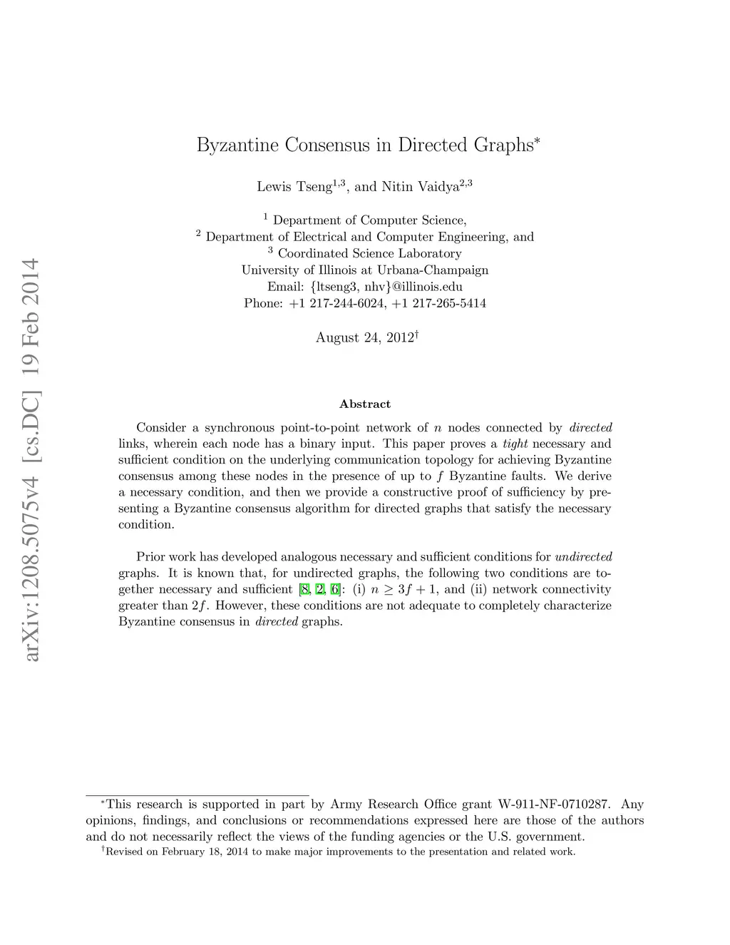Consider a synchronous point-to-point network of n nodes connected by directed links, wherein each node has a binary input. This paper proves a tight necessary and sufficient condition on the underlying communication topology for achieving Byzantine consensus among these nodes in the presence of up to f Byzantine faults. We derive a necessary condition, and then we provide a constructive proof of sufficiency by presenting a Byzantine consensus algorithm for directed graphs that satisfy the necessary condition. Prior work has developed analogous necessary and sufficient conditions for undirected graphs. It is known that, for undirected graphs, the following two conditions are together necessary and sufficient [8, 2, 6]: (i) n ? 3f + 1, and (ii) network connectivity greater than 2f. However, these conditions are not adequate to completely characterize Byzantine consensus in directed graphs.