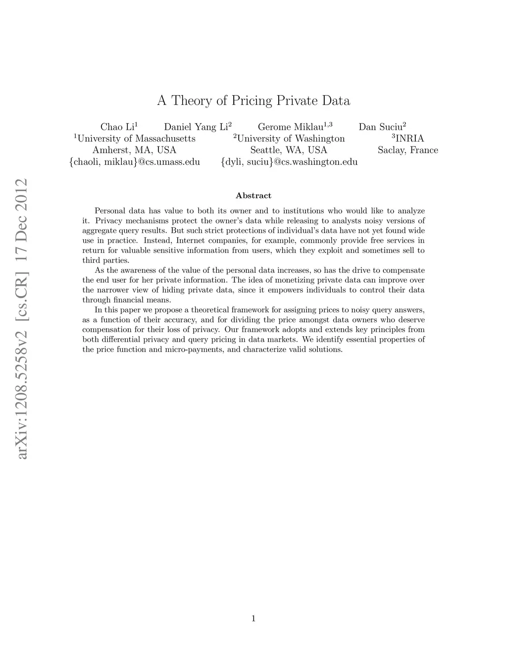 Personal data has value to both its owner and to institutions who would like to analyze it. Privacy mechanisms protect the owner's data while releasing to analysts noisy versions of aggregate query results. But such strict protections of individual's data have not yet found wide use in practice. Instead, Internet companies, for example, commonly provide free services in return for valuable sensitive information from users, which they exploit and sometimes sell to third parties. As the awareness of the value of the personal data increases, so has the drive to compensate the end user for her private information. The idea of monetizing private data can improve over the narrower view of hiding private data, since it empowers individuals to control their data through financial means. In this paper we propose a theoretical framework for assigning prices to noisy query answers, as a function of their accuracy, and for dividing the price amongst data owners who deserve compensation for their loss of privacy. Our framework adopts and extends key principles from both differential privacy and query pricing in data markets. We identify essential properties of the price function and micro-payments, and characterize valid solutions.