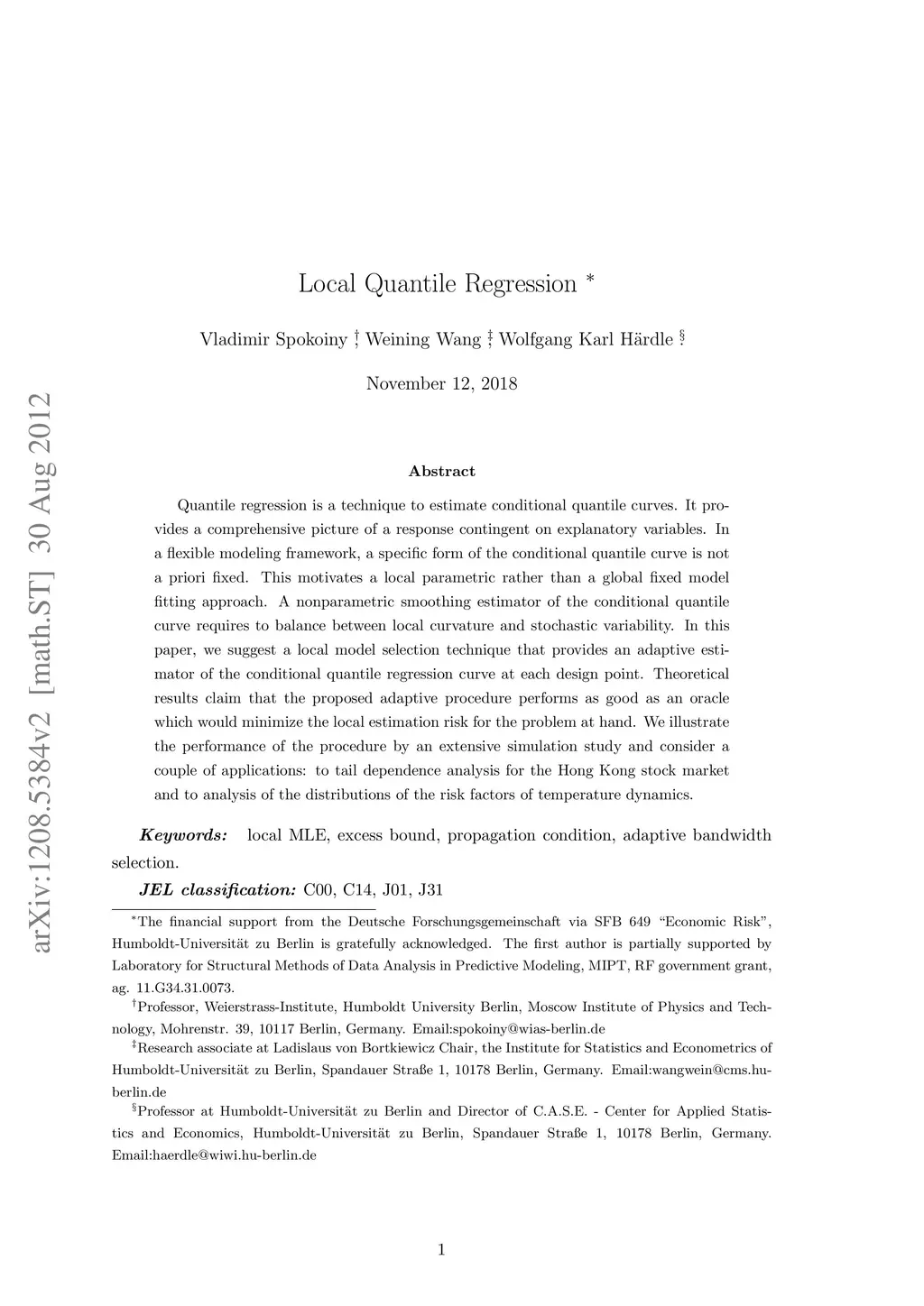 Quantile regression is a technique to estimate conditional quantile curves. It provides a comprehensive picture of a response contingent on explanatory variables. In a flexible modeling framework, a specific form of the conditional quantile curve is not a priori fixed. % Indeed, the majority of applications do not per se require specific functional forms. This motivates a local parametric rather than a global fixed model fitting approach. A nonparametric smoothing estimator of the conditional quantile curve requires to balance between local curvature and stochastic variability. In this paper, we suggest a local model selection technique that provides an adaptive estimator of the conditional quantile regression curve at each design point. Theoretical results claim that the proposed adaptive procedure performs as good as an oracle which would minimize the local estimation risk for the problem at hand. We illustrate the performance of the procedure by an extensive simulation study and consider a couple of applications: to tail dependence analysis for the Hong Kong stock market and to analysis of the distributions of the risk factors of temperature dynamics.
