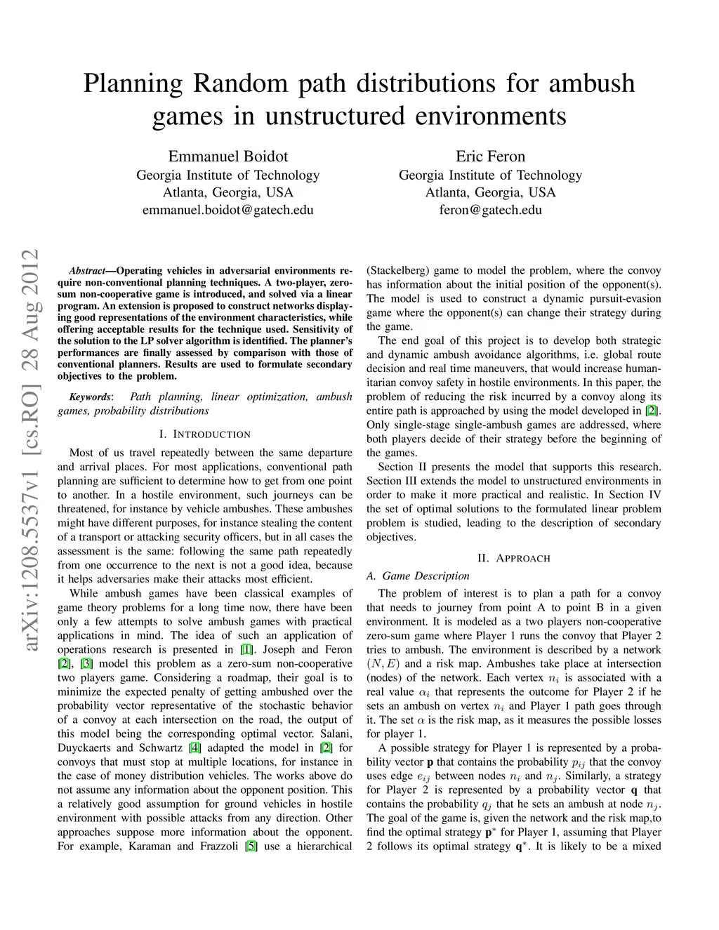 Operating vehicles in adversarial environments require non-conventional planning techniques. A two-player, zero-sum non-cooperative game is introduced, which is solved via a linear program. An extension is proposed to construct networks displaying good representations of the environment characteristics, while offering acceptable results for the technique used. Sensitivity of the solution to the LP solver algorithm is identified. The performances of the planner are finally assessed by comparison with those of conventional planners. Results are used to formulate secondary objectives to the problem.