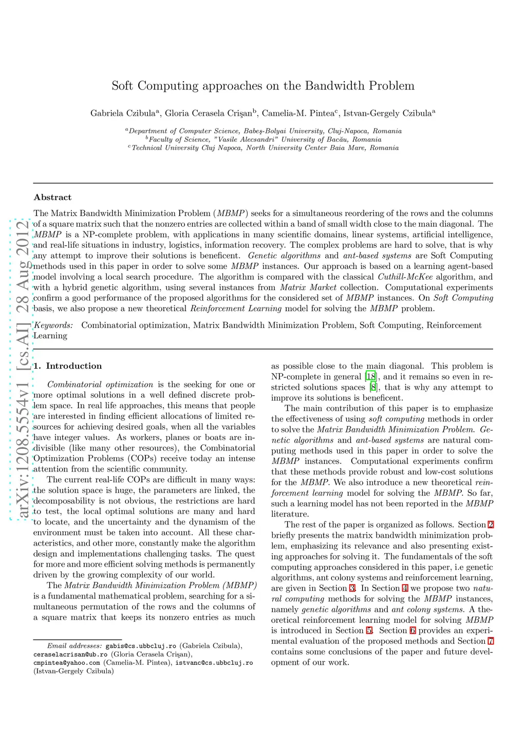 The Matrix Bandwidth Minimization Problem (MBMP) seeks for a simultaneous reordering of the rows and the columns of a square matrix such that the nonzero entries are collected within a band of small width close to the main diagonal. The MBMP is a NP-complete problem, with applications in many scientific domains, linear systems, artificial intelligence, and real-life situations in industry, logistics, information recovery. The complex problems are hard to solve, that is why any attempt to improve their solutions is beneficent. Genetic algorithms and ant-based systems are Soft Computing methods used in this paper in order to solve some MBMP instances. Our approach is based on a learning agent-based model involving a local search procedure. The algorithm is compared with the classical Cuthill-McKee algorithm, and with a hybrid genetic algorithm, using several instances from Matrix Market collection. Computational experiments confirm a good performance of the proposed algorithms for the considered set of MBMP instances. On Soft Computing basis, we also propose a new theoretical Reinforcement Learning model for solving the MBMP problem.