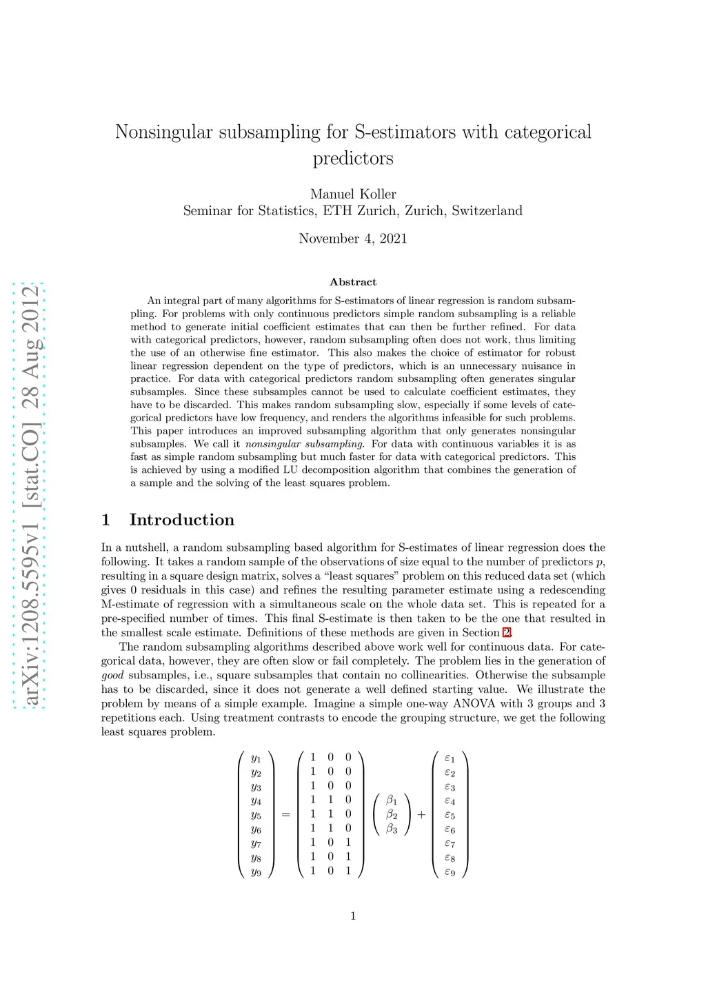 An integral part of many algorithms for S-estimators of linear regression is random subsampling. For problems with only continuous predictors simple random subsampling is a reliable method to generate initial coefficient estimates that can then be further refined. For data with categorical predictors, however, random subsampling often does not work, thus limiting the use of an otherwise fine estimator. This also makes the choice of estimator for robust linear regression dependent on the type of predictors, which is an unnecessary nuisance in practice. For data with categorical predictors random subsampling often generates singular subsamples. Since these subsamples cannot be used to calculate coefficient estimates, they have to be discarded. This makes random subsampling slow, especially if some levels of categorical predictors have low frequency, and renders the algorithms infeasible for such problems. This paper introduces an improved subsampling algorithm that only generates nonsingular subsamples. We call it nonsingular subsampling. For data with continuous variables it is as fast as simple random subsampling but much faster for data with categorical predictors. This is achieved by using a modified LU decomposition algorithm that combines the generation of a sample and the solving of the least squares problem.