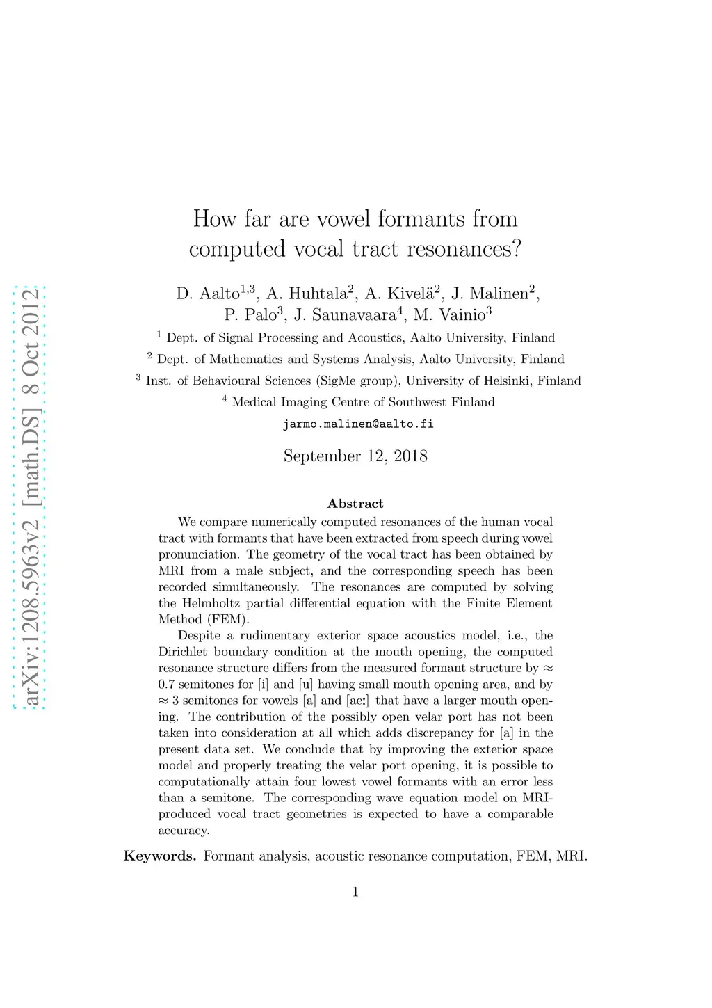 We compare numerically computed resonances of the human vocal tract with formants that have been extracted from speech during vowel pronunciation. The geometry of the vocal tract has been obtained by MRI from a male subject, and the corresponding speech has been recorded simultaneously. The resonances are computed by solving the Helmholtz partial differential equation with the Finite Element Method (FEM). Despite a rudimentary exterior space acoustics model, i.e., the Dirichlet boundary condition at the mouth opening, the computed resonance structure differs from the measured formant structure by 0.7 semitones for [i] and [u] having small mouth opening area, and by 3 semitones for vowels [a] and [ae] that have a larger mouth opening. The contribution of the possibly open velar port has not been taken into considaration at all which adds the discrepancy for [a] in the present data set. We conclude that by improving the exterior space model and properly treating the velar port opening, it is possible to computationally attain four lowest vowel formants with an error less than a semitone. The corresponding wave equation model on MRI-produced vocal tract geometries is expected to have a comparable accuracy.