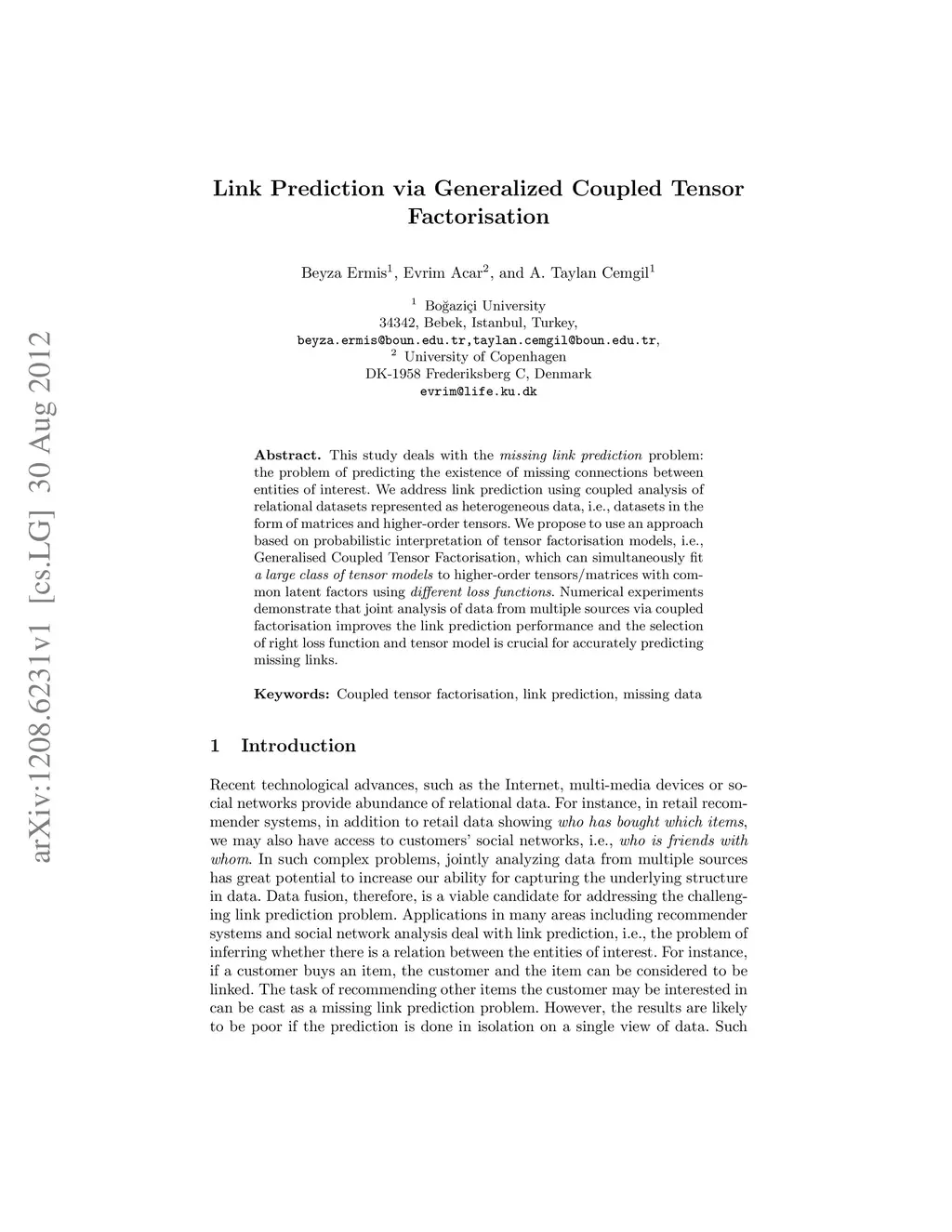 This study deals with the missing link prediction problem: the problem of predicting the existence of missing connections between entities of interest. We address link prediction using coupled analysis of relational datasets represented as heterogeneous data, i.e., datasets in the form of matrices and higher-order tensors. We propose to use an approach based on probabilistic interpretation of tensor factorisation models, i.e., Generalised Coupled Tensor Factorisation, which can simultaneously fit a large class of tensor models to higher-order tensors/matrices with com- mon latent factors using different loss functions. Numerical experiments demonstrate that joint analysis of data from multiple sources via coupled factorisation improves the link prediction performance and the selection of right loss function and tensor model is crucial for accurately predicting missing links.