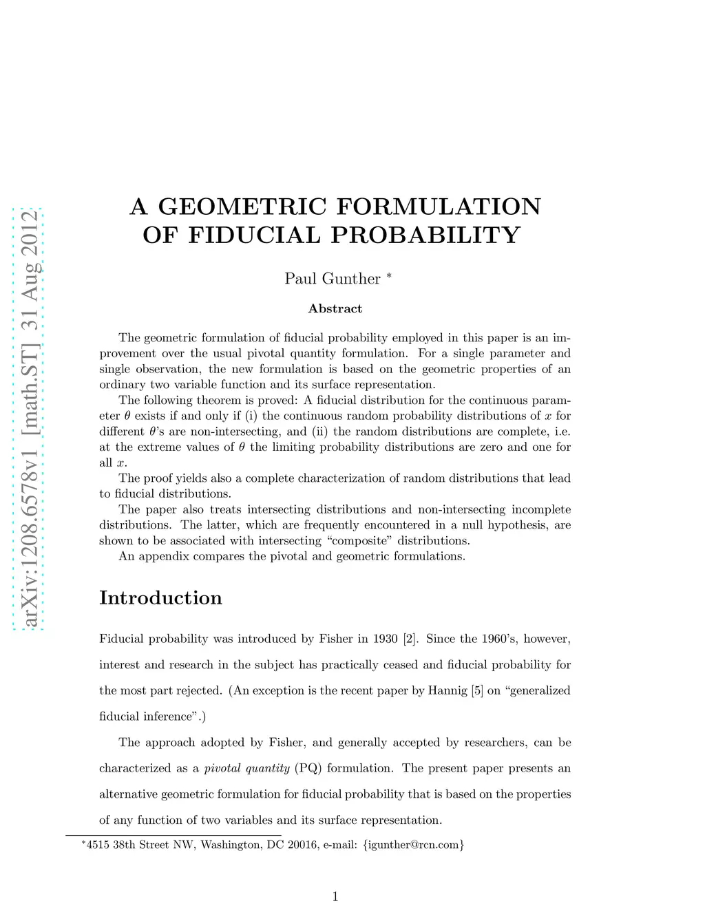 The geometric formulation of fiducial probability employed in this paper is an improvement over the usual pivotal quantity formulation. For a single parameter and single observation, the new formulation is based on the geometric properties of an ordinary two variable function and its surface representation. The following theorem is proved: A fiducial distribution for the continuous parameter exists if and only if (i) the continuous random probability distributions of for different 's are non-intersecting, and (ii) the random distributions are complete, i.e. at the extreme values of the limiting probability distributions are zero and one for all . The proof yields also a complete characterization of random distributions that lead to fiducial distributions. The paper also treats intersecting distributions and non-intersecting incomplete distributions. The latter, which are frequently encountered in a null hypothesis, are shown to be associated with intersecting "composite" distributions. An appendix compares the pivotal and geometric formulations.