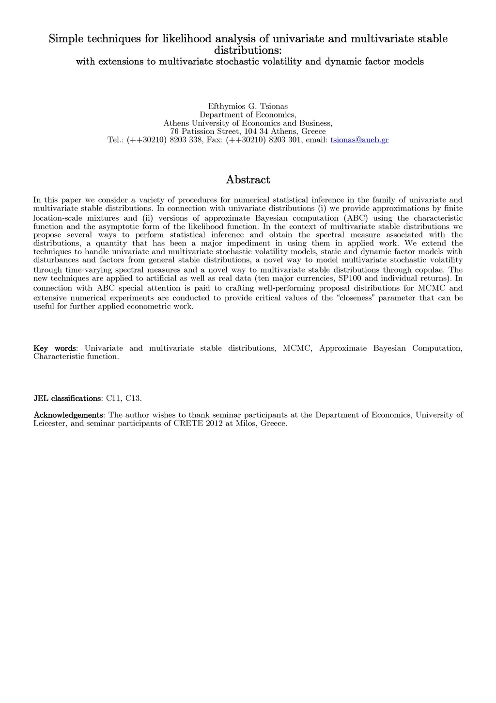 In this paper we consider a variety of procedures for numerical statistical inference in the family of univariate and multivariate stable distributions. In connection with univariate distributions (i) we provide approximations by finite location-scale mixtures and (ii) versions of approximate Bayesian computation (ABC) using the characteristic function and the asymptotic form of the likelihood function. In the context of multivariate stable distributions we propose several ways to perform statistical inference and obtain the spectral measure associated with the distributions, a quantity that has been a major impediment in using them in applied work. We extend the techniques to handle univariate and multivariate stochastic volatility models, static and dynamic factor models with disturbances and factors from general stable distributions, a novel way to model multivariate stochastic volatility through time-varying spectral measures and a novel way to multivariate stable distributions through copulae. The new techniques are applied to artificial as well as real data (ten major currencies, SP100 and individual returns). In connection with ABC special attention is paid to crafting well-performing proposal distributions for MCMC and extensive numerical experiments are conducted to provide critical values of the "closeness" parameter that can be useful for further applied econometric work.