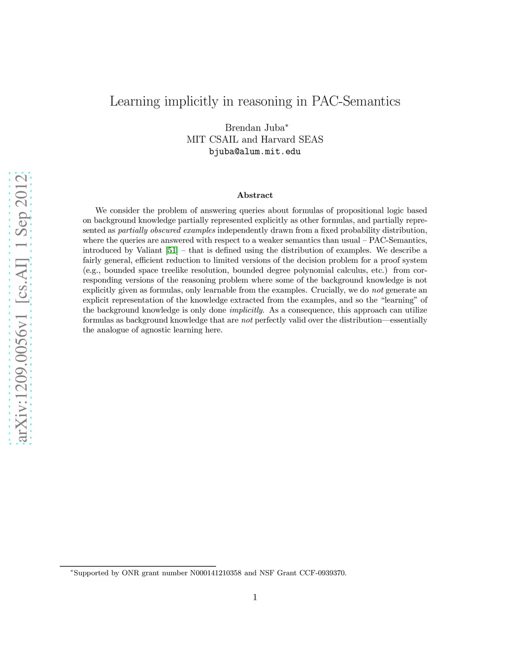 We consider the problem of answering queries about formulas of propositional logic based on background knowledge partially represented explicitly as other formulas, and partially represented as partially obscured examples independently drawn from a fixed probability distribution, where the queries are answered with respect to a weaker semantics than usual -- PAC-Semantics, introduced by Valiant (2000) -- that is defined using the distribution of examples. We describe a fairly general, efficient reduction to limited versions of the decision problem for a proof system (e.g., bounded space treelike resolution, bounded degree polynomial calculus, etc.) from corresponding versions of the reasoning problem where some of the background knowledge is not explicitly given as formulas, only learnable from the examples. Crucially, we do not generate an explicit representation of the knowledge extracted from the examples, and so the "learning" of the background knowledge is only done implicitly. As a consequence, this approach can utilize formulas as background knowledge that are not perfectly valid over the distribution---essentially the analogue of agnostic learning here.