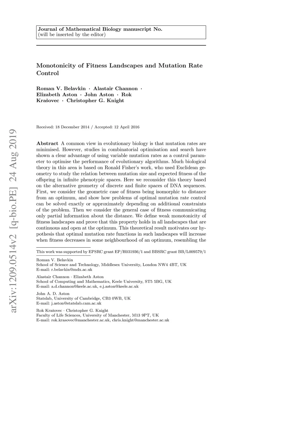 A common view in evolutionary biology is that mutation rates are minimised. However, studies in combinatorial optimisation and search have shown a clear advantage of using variable mutation rates as a control parameter to optimise the performance of evolutionary algorithms. Much biological theory in this area is based on Ronald Fisher's work, who used Euclidean geometry to study the relation between mutation size and expected fitness of the offspring in infinite phenotypic spaces. Here we reconsider this theory based on the alternative geometry of discrete and finite spaces of DNA sequences. First, we consider the geometric case of fitness being isomorphic to distance from an optimum, and show how problems of optimal mutation rate control can be solved exactly or approximately depending on additional constraints of the problem. Then we consider the general case of fitness communicating only partial information about the distance. We define weak monotonicity of fitness landscapes and prove that this property holds in all landscapes that are continuous and open at the optimum. This theoretical result motivates our hypothesis that optimal mutation rate functions in such landscapes will increase when fitness decreases in some neighbourhood of an optimum, resembling the control functions derived in the geometric case. We test this hypothesis experimentally by analysing approximately optimal mutation rate control functions in 115 complete landscapes of binding scores between DNA sequences and transcription factors. Our findings support the hypothesis and find that the increase of mutation rate is more rapid in landscapes that are less monotonic (more rugged). We discuss the relevance of these findings to living organisms.