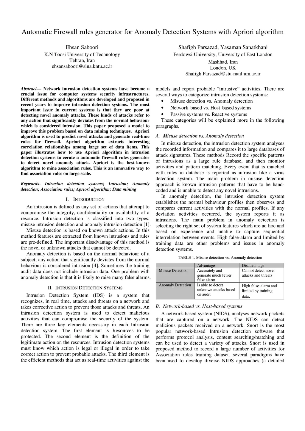 Network intrusion detection systems have become a crucial issue for computer systems security infrastructures. Different methods and algorithms are developed and proposed in recent years to improve intrusion detection systems. The most important issue in current systems is that they are poor at detecting novel anomaly attacks. These kinds of attacks refer to any action that significantly deviates from the normal behaviour which is considered intrusion. This paper proposed a model to improve this problem based on data mining techniques. Apriori algorithm is used to predict novel attacks and generate real-time rules for firewall. Apriori algorithm extracts interesting correlation relationships among large set of data items. This paper illustrates how to use Apriori algorithm in intrusion detection systems to cerate a automatic firewall rules generator to detect novel anomaly attack. Apriori is the best-known algorithm to mine association rules. This is an innovative way to find association rules on large scale.