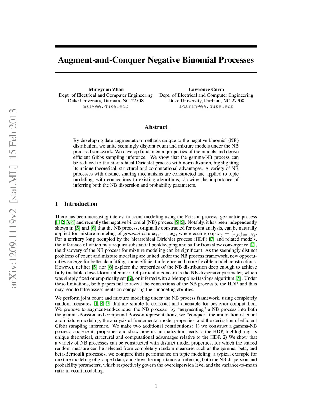 By developing data augmentation methods unique to the negative binomial (NB) distribution, we unite seemingly disjoint count and mixture models under the NB process framework. We develop fundamental properties of the models and derive efficient Gibbs sampling inference. We show that the gamma-NB process can be reduced to the hierarchical Dirichlet process with normalization, highlighting its unique theoretical, structural and computational advantages. A variety of NB processes with distinct sharing mechanisms are constructed and applied to topic modeling, with connections to existing algorithms, showing the importance of inferring both the NB dispersion and probability parameters.