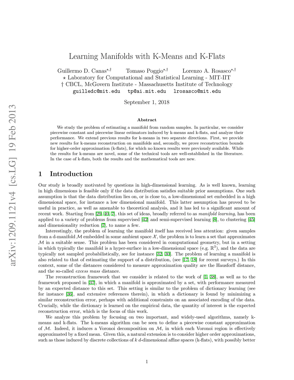 We study the problem of estimating a manifold from random samples. In particular, we consider piecewise constant and piecewise linear estimators induced by k-means and k-flats, and analyze their performance. We extend previous results for k-means in two separate directions. First, we provide new results for k-means reconstruction on manifolds and, secondly, we prove reconstruction bounds for higher-order approximation (k-flats), for which no known results were previously available. While the results for k-means are novel, some of the technical tools are well-established in the literature. In the case of k-flats, both the results and the mathematical tools are new.