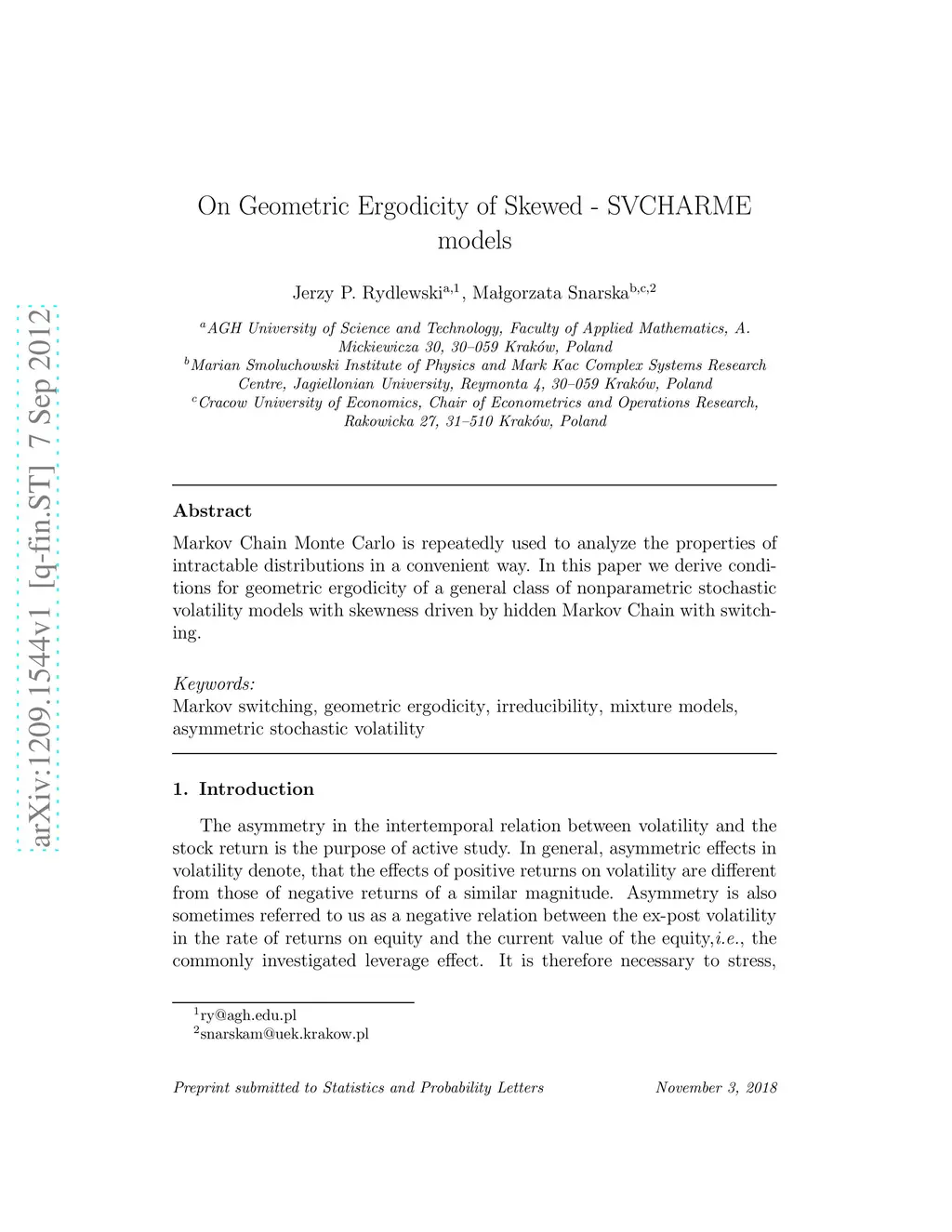Markov Chain Monte Carlo is repeatedly used to analyze the properties of intractable distributions in a convenient way. In this paper we derive conditions for geometric ergodicity of a general class of nonparametric stochastic volatility models with skewness driven by hidden Markov Chain with switching.