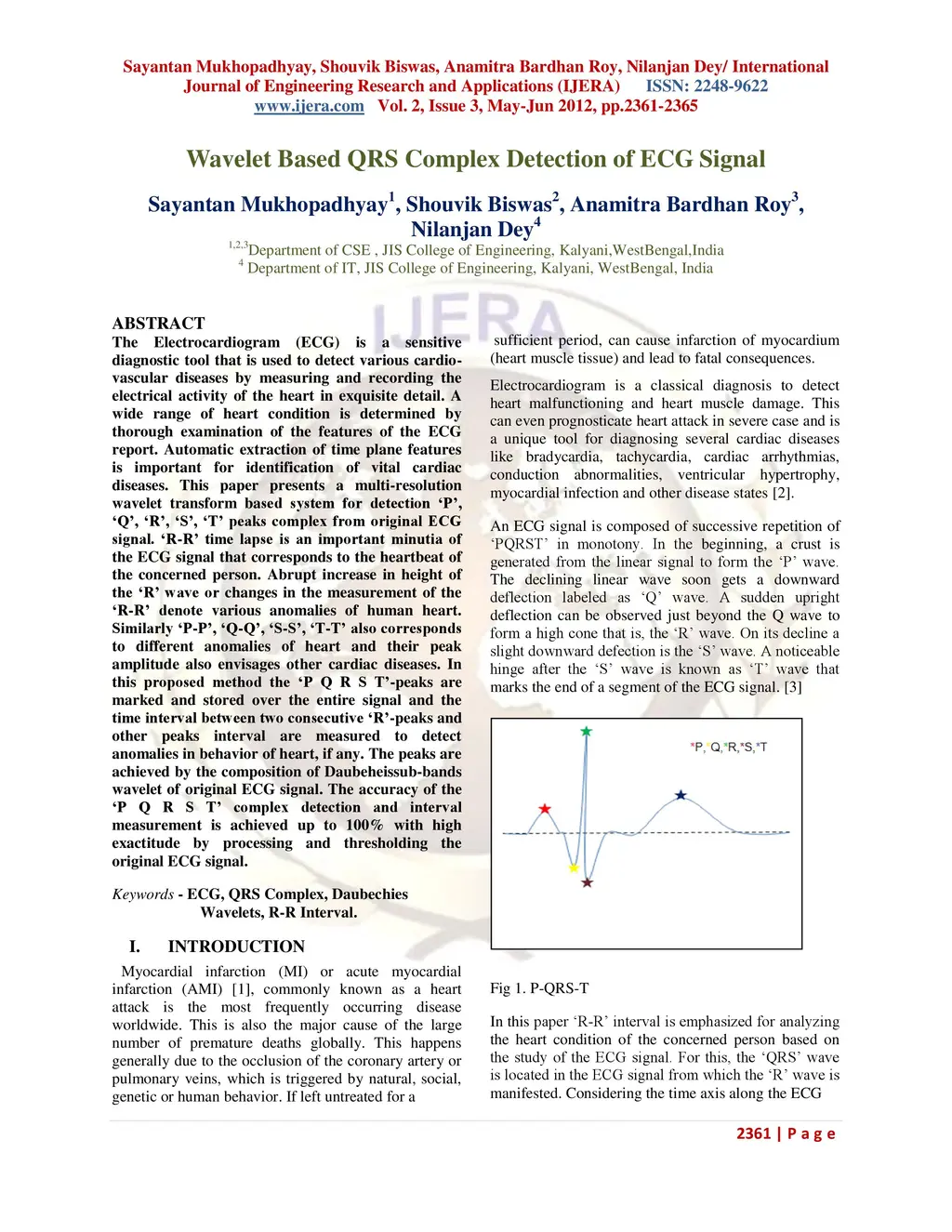 The Electrocardiogram (ECG) is a sensitive diagnostic tool that is used to detect various cardiovascular diseases by measuring and recording the electrical activity of the heart in exquisite detail. A wide range of heart condition is determined by thorough examination of the features of the ECG report. Automatic extraction of time plane features is important for identification of vital cardiac diseases. This paper presents a multi-resolution wavelet transform based system for detection 'P', 'Q', 'R', 'S', 'T' peaks complex from original ECG signal. 'R-R' time lapse is an important minutia of the ECG signal that corresponds to the heartbeat of the concerned person. Abrupt increase in height of the 'R' wave or changes in the measurement of the 'R-R' denote various anomalies of human heart. Similarly 'P-P', 'Q-Q', 'S-S', 'T-T' also corresponds to different anomalies of heart and their peak amplitude also envisages other cardiac diseases. In this proposed method the 'PQRST' peaks are marked and stored over the entire signal and the time interval between two consecutive 'R' peaks and other peaks interval are measured to detect anomalies in behavior of heart, if any. The peaks are achieved by the composition of Daubeheissub bands wavelet of original ECG signal. The accuracy of the 'PQRST' complex detection and interval measurement is achieved up to 100% with high exactitude by processing and thresholding the original ECG signal.