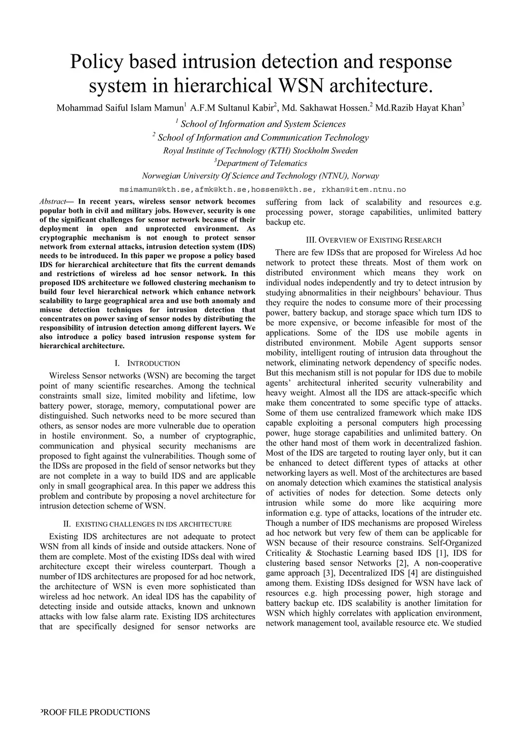In recent years, wireless sensor network becomes popular both in civil and military jobs. However, security is one of the significant challenges for sensor network because of their deployment in open and unprotected environment. As cryptographic mechanism is not enough to protect sensor network from external attacks, intrusion detection system (IDS) needs to be introduced. In this paper we propose a policy based IDS for hierarchical architecture that fits the current demands and restrictions of wireless ad hoc sensor network. In this proposed IDS architecture we followed clustering mechanism to build four level hierarchical network which enhance network scalability to large geographical area and use both anomaly and misuse detection techniques for intrusion detection that concentrates on power saving of sensor nodes by distributing the responsibility of intrusion detection among different layers. We also introduce a policy based intrusion response system for hierarchical architecture.