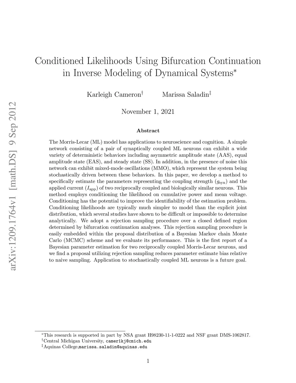 The Morris-Lecar (ML) model has applications to neuroscience and cognition. A simple network consisting of a pair of synaptically coupled ML neurons can exhibit a wide variety of deterministic behaviors including asymmetric amplitude state (AAS), equal amplitude state (EAS), and steady state (SS). In addition, in the presence of noise this network can exhibit mixed-mode oscillations (MMO), which represent the system being stochastically driven between these behaviors. In this paper, we develop a method to specifically estimate the parameters representing the coupling strength (gsyn) and the applied current (Iapp) of two reciprocally coupled and biologically similar neurons. This method employs conditioning the likelihood on cumulative power and mean voltage. Conditioning has the potential to improve the identifiability of the estimation problem. Conditioning likelihoods are typically much simpler to model than the explicit joint distribution, which several studies have shown to be difficult or impossible to determine analytically. We adopt a rejection sampling procedure over a closed defined region determined by bifurcation continuation analyses. This rejection sampling procedure is easily embedded within the proposal distribution of a Bayesian Markov chain Monte Carlo (MCMC) scheme and we evaluate its performance. This is the first report of a Bayesian parameter estimation for two reciprocally coupled Morris-Lecar neurons, and we find a proposal utilizing rejection sampling reduces parameter estimate bias relative to naive sampling. Application to stochastically coupled ML neurons is a future goal.