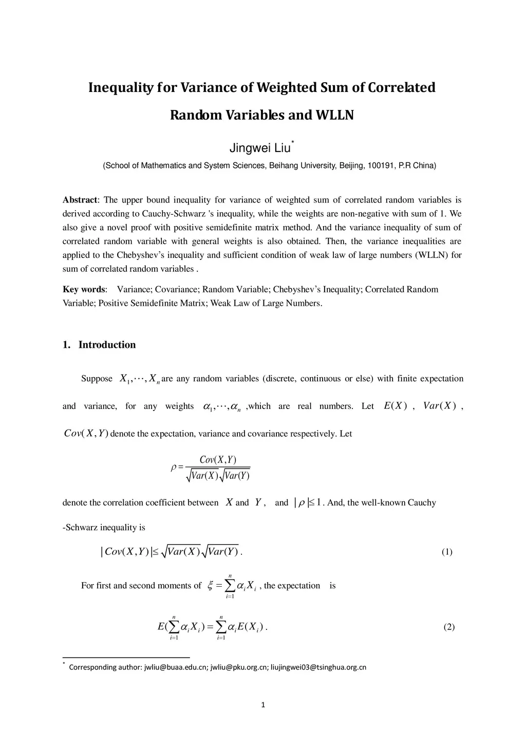 The upper bound inequality for variance of weighted sum of correlated random variables is derived according to Cauchy-Schwarz's inequality, while the weights are non-negative with sum of 1. We also give a novel proof with positive semidefinite matrix method. And the variance inequality of sum of correlated random variable with general weights is also obtained. Then, the variance inequalities are applied to the Chebyshev's inequality and sufficient condition of weak law of large numbers (WLLN) for sum of correlated random variables .