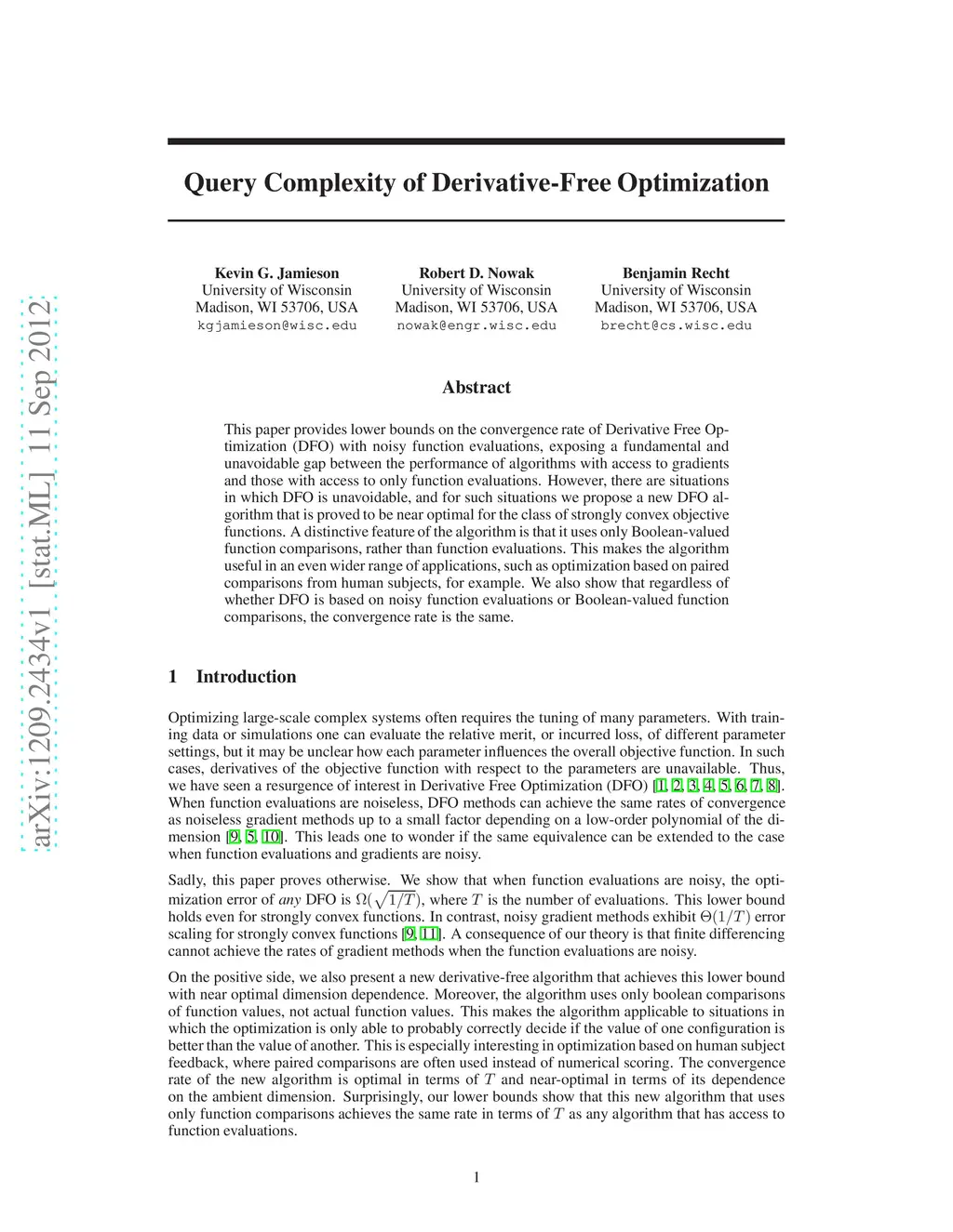 This paper provides lower bounds on the convergence rate of Derivative Free Optimization (DFO) with noisy function evaluations, exposing a fundamental and unavoidable gap between the performance of algorithms with access to gradients and those with access to only function evaluations. However, there are situations in which DFO is unavoidable, and for such situations we propose a new DFO algorithm that is proved to be near optimal for the class of strongly convex objective functions. A distinctive feature of the algorithm is that it uses only Boolean-valued function comparisons, rather than function evaluations. This makes the algorithm useful in an even wider range of applications, such as optimization based on paired comparisons from human subjects, for example. We also show that regardless of whether DFO is based on noisy function evaluations or Boolean-valued function comparisons, the convergence rate is the same.