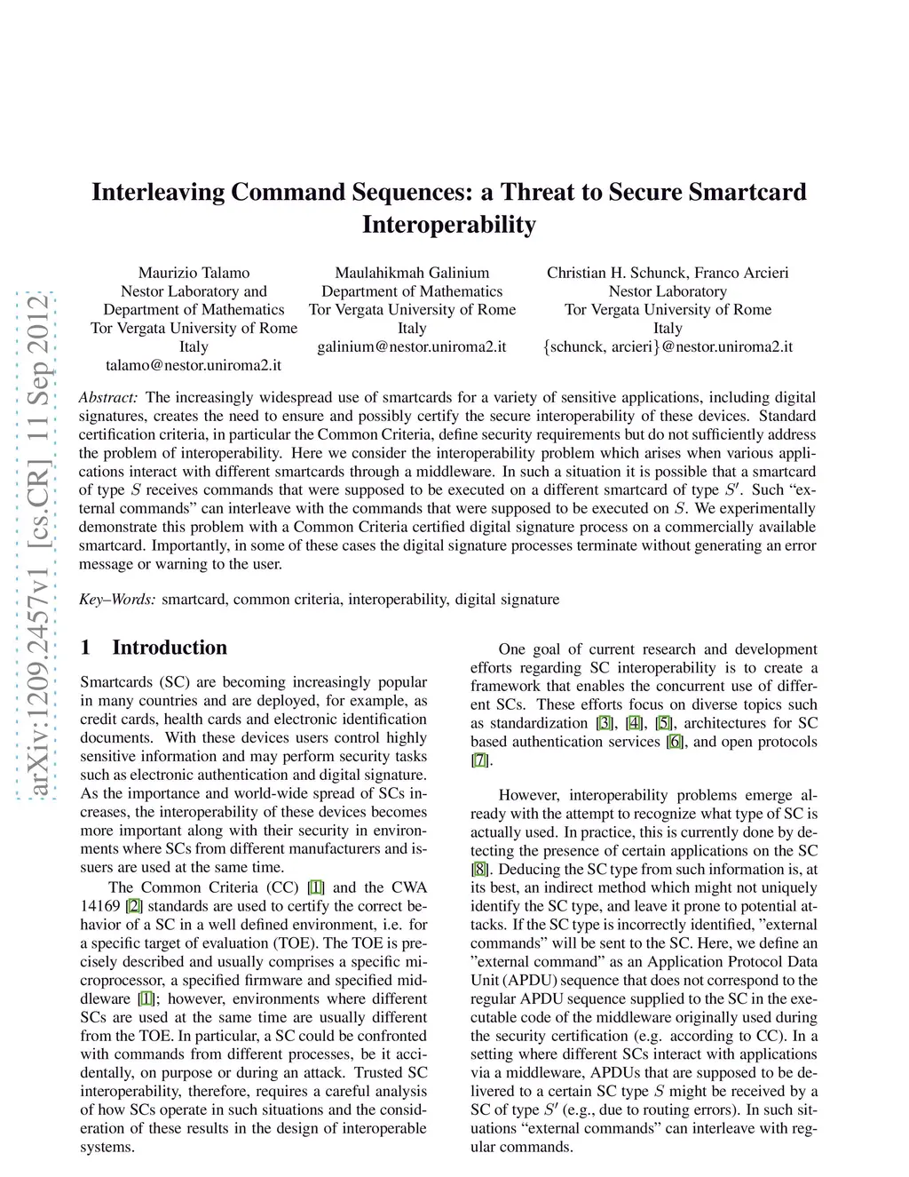 The increasingly widespread use of smartcards for a variety of sensitive applications, including digital signatures, creates the need to ensure and possibly certify the secure interoperability of these devices. Standard certification criteria, in particular the Common Criteria, define security requirements but do not sufficiently address the problem of interoperability. Here we consider the interoperability problem which arises when various applications interact with different smartcards through a middleware. In such a situation it is possible that a smartcard of type S receives commands that were supposed to be executed on a different smartcard of type S'. Such "external commands" can interleave with the commands that were supposed to be executed on S. We experimentally demonstrate this problem with a Common Criteria certified digital signature process on a commercially available smartcard. Importantly, in some of these cases the digital signature processes terminate without generating an error message or warning to the user.