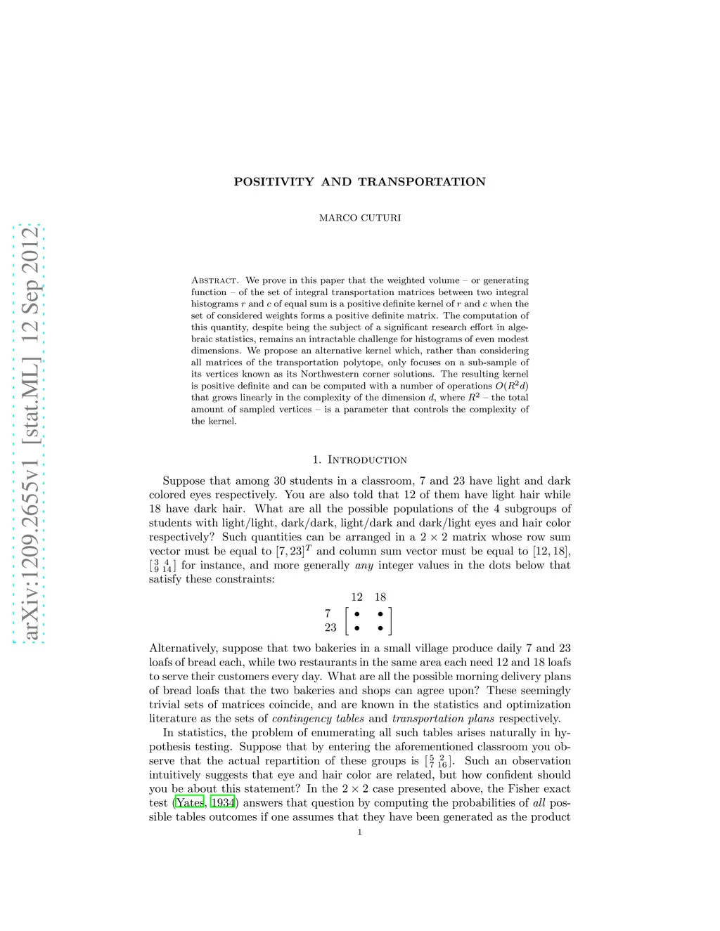 We prove in this paper that the weighted volume of the set of integral transportation matrices between two integral histograms r and c of equal sum is a positive definite kernel of r and c when the set of considered weights forms a positive definite matrix. The computation of this quantity, despite being the subject of a significant research effort in algebraic statistics, remains an intractable challenge for histograms of even modest dimensions. We propose an alternative kernel which, rather than considering all matrices of the transportation polytope, only focuses on a sub-sample of its vertices known as its Northwestern corner solutions. The resulting kernel is positive definite and can be computed with a number of operations O(R^2d) that grows linearly in the complexity of the dimension d, where R^2, the total amount of sampled vertices, is a parameter that controls the complexity of the kernel.