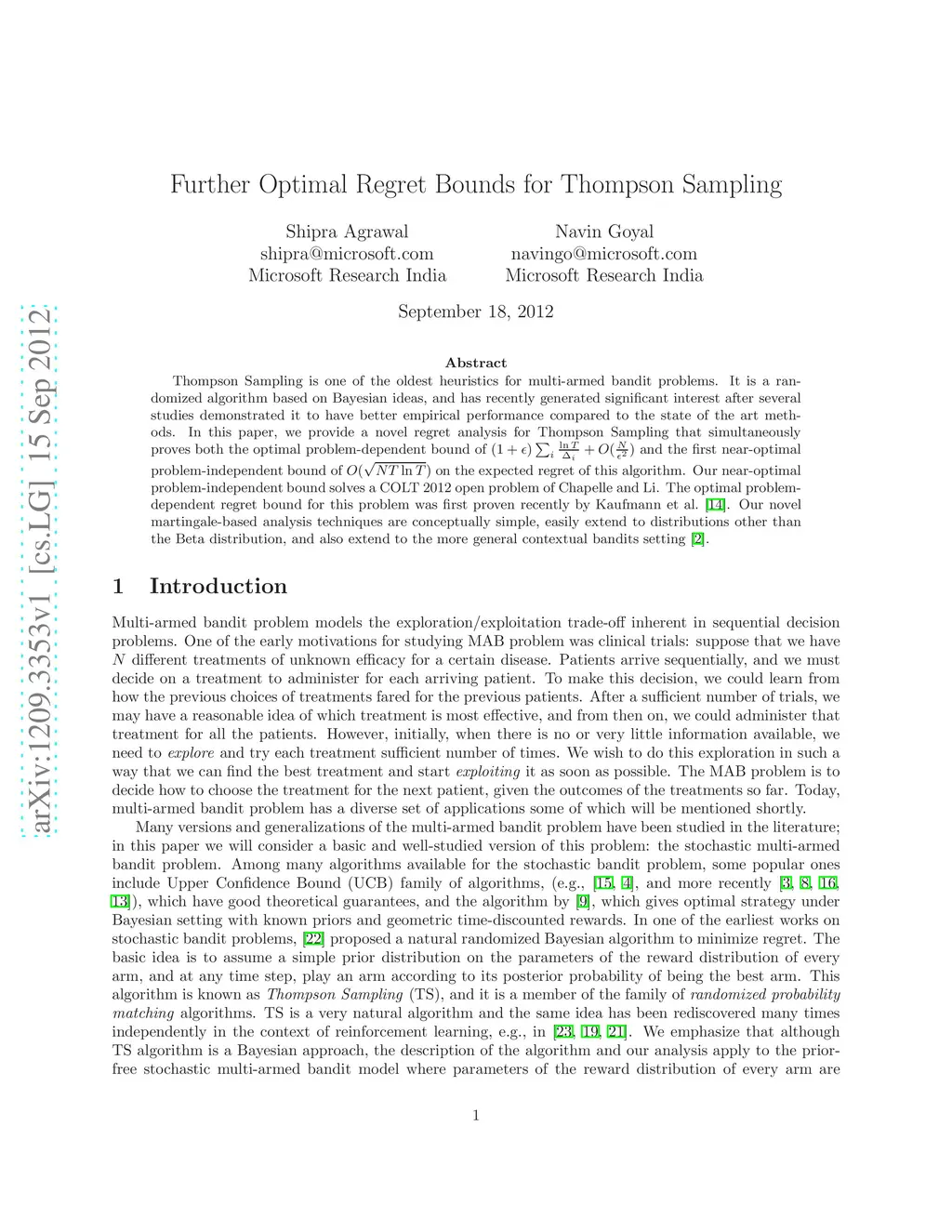 Thompson Sampling is one of the oldest heuristics for multi-armed bandit problems. It is a randomized algorithm based on Bayesian ideas, and has recently generated significant interest after several studies demonstrated it to have better empirical performance compared to the state of the art methods. In this paper, we provide a novel regret analysis for Thompson Sampling that simultaneously proves both the optimal problem-dependent bound of and the first near-optimal problem-independent bound of on the expected regret of this algorithm. Our near-optimal problem-independent bound solves a COLT 2012 open problem of Chapelle and Li. The optimal problem-dependent regret bound for this problem was first proven recently by Kaufmann et al. [ALT 2012]. Our novel martingale-based analysis techniques are conceptually simple, easily extend to distributions other than the Beta distribution, and also extend to the more general contextual bandits setting [Manuscript, Agrawal and Goyal, 2012].