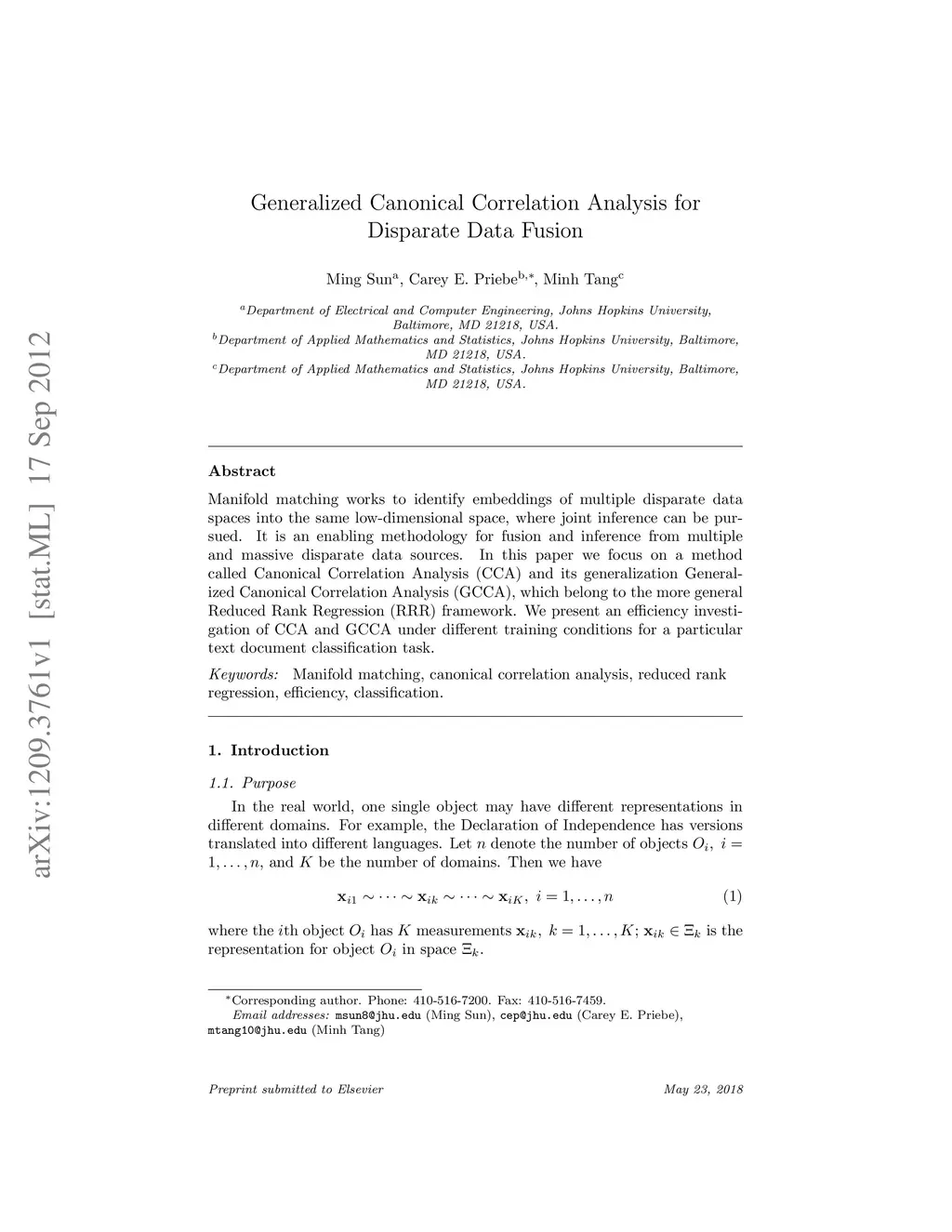 Manifold matching works to identify embeddings of multiple disparate data spaces into the same low-dimensional space, where joint inference can be pursued. It is an enabling methodology for fusion and inference from multiple and massive disparate data sources. In this paper we focus on a method called Canonical Correlation Analysis (CCA) and its generalization Generalized Canonical Correlation Analysis (GCCA), which belong to the more general Reduced Rank Regression (RRR) framework. We present an efficiency investigation of CCA and GCCA under different training conditions for a particular text document classification task.