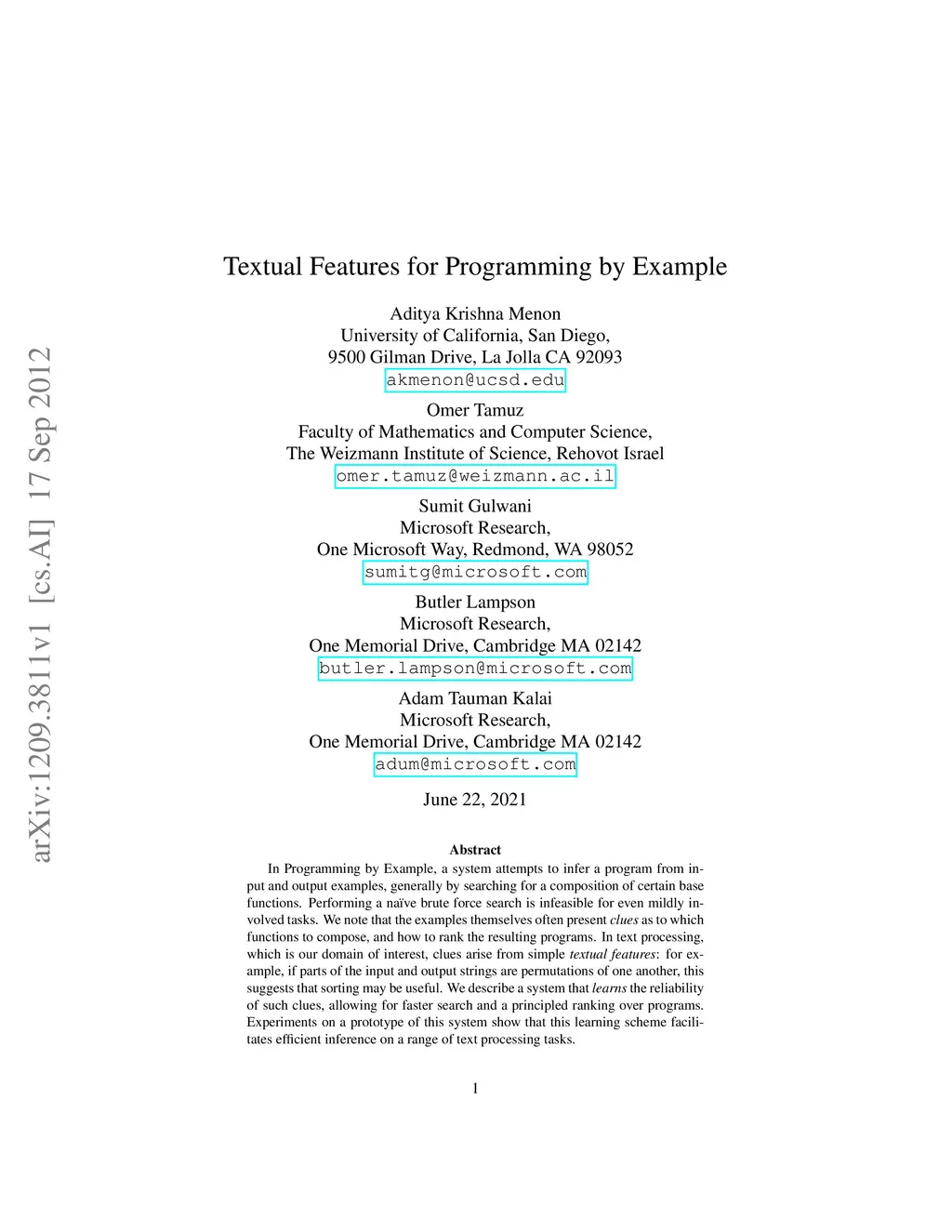 In Programming by Example, a system attempts to infer a program from input and output examples, generally by searching for a composition of certain base functions. Performing a naive brute force search is infeasible for even mildly involved tasks. We note that the examples themselves often present clues as to which functions to compose, and how to rank the resulting programs. In text processing, which is our domain of interest, clues arise from simple textual features: for example, if parts of the input and output strings are permutations of one another, this suggests that sorting may be useful. We describe a system that learns the reliability of such clues, allowing for faster search and a principled ranking over programs. Experiments on a prototype of this system show that this learning scheme facilitates efficient inference on a range of text processing tasks.