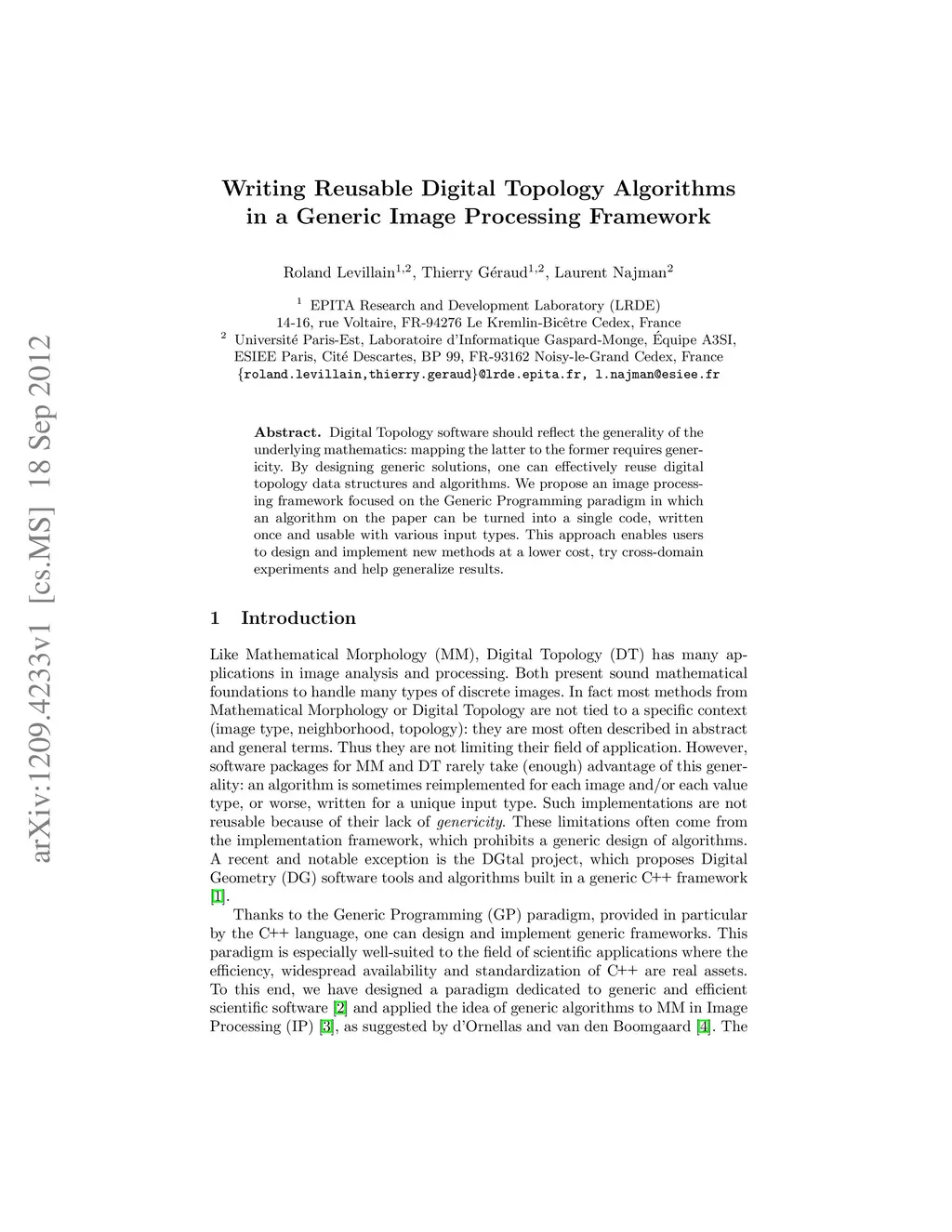 Digital Geometry software should reflect the generality of the underlying mathe- matics: mapping the latter to the former requires genericity. By designing generic solutions, one can effectively reuse digital geometry data structures and algorithms. We propose an image processing framework focused on the Generic Programming paradigm in which an algorithm on the paper can be turned into a single code, written once and usable with various input types. This approach enables users to design and implement new methods at a lower cost, try cross-domain experiments and help generalize results