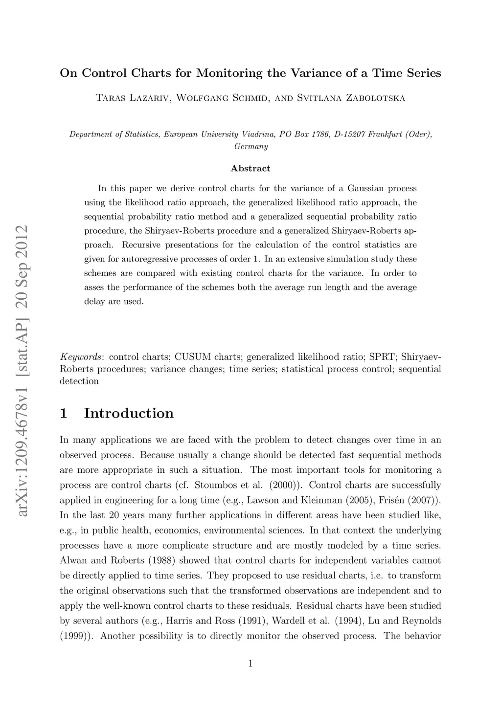 In this paper we derive control charts for the variance of a Gaussian process using the likelihood ratio approach, the generalized likelihood ratio approach, the sequential probability ratio method and a generalized sequential probability ratio procedure, the Shiryaev-Roberts procedure and a generalized Shiryaev-Roberts ap- proach. Recursive presentations for the calculation of the control statistics are given for autoregressive processes of order 1. In an extensive simulation study these schemes are compared with existing control charts for the variance. In order to asses the performance of the schemes both the average run length and the average delay are used.