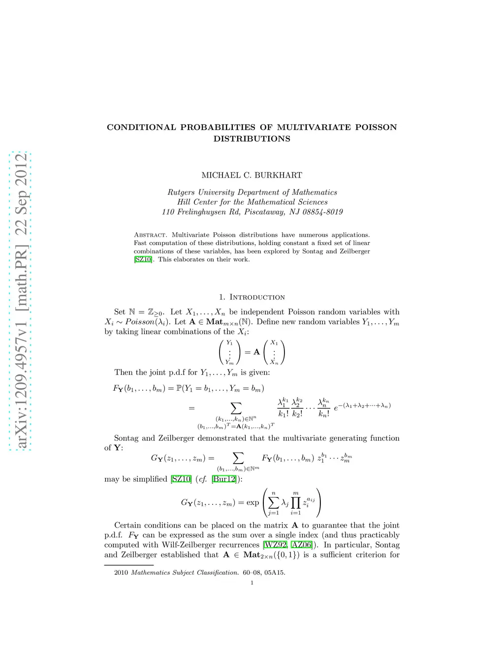 Multivariate Poisson distributions have numerous applications. Fast computation of these distributions, holding constant a fixed set of linear combinations of these variables, has been explored by Sontag and Zeilberger. This elaborates on their work.