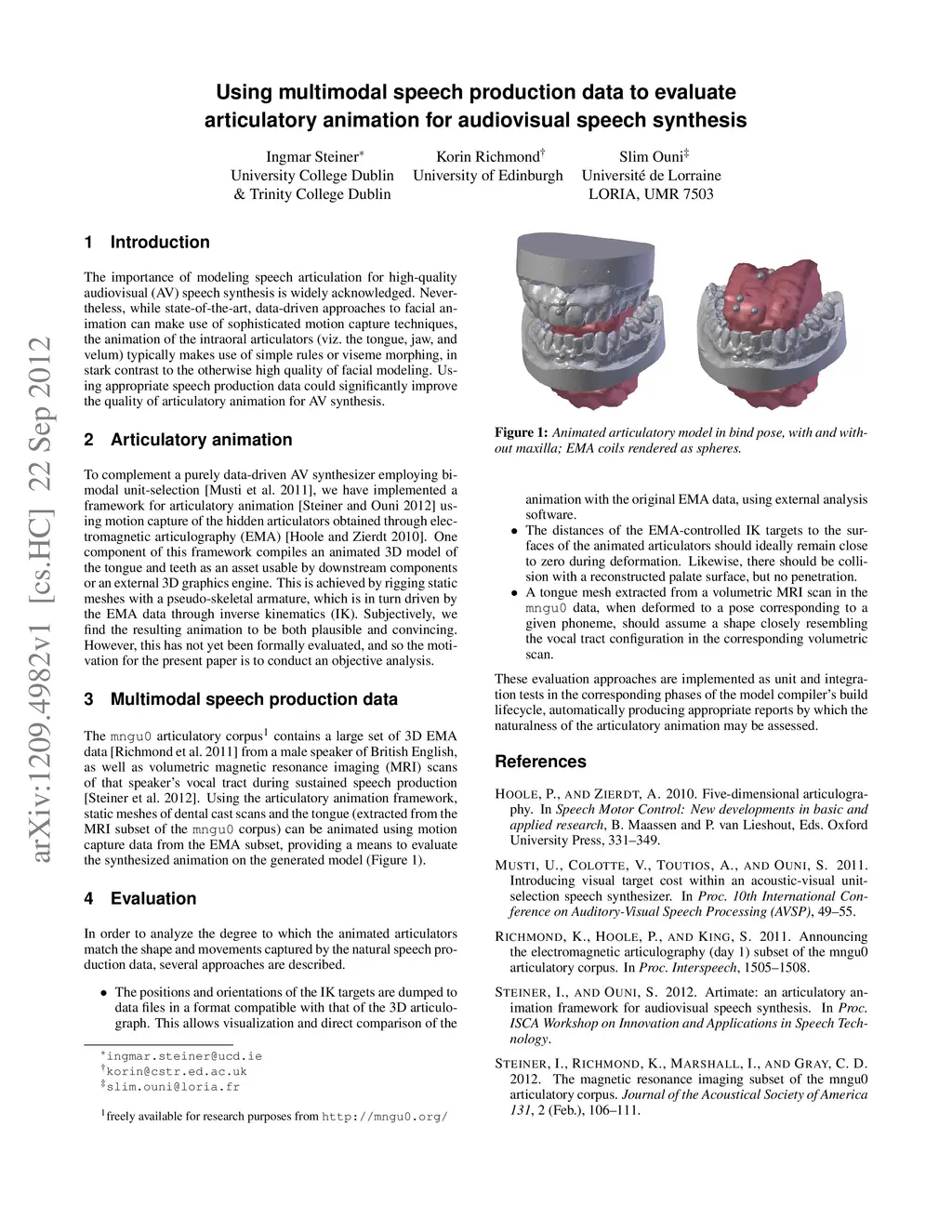 The importance of modeling speech articulation for high-quality audiovisual (AV) speech synthesis is widely acknowledged. Nevertheless, while state-of-the-art, data-driven approaches to facial animation can make use of sophisticated motion capture techniques, the animation of the intraoral articulators (viz. the tongue, jaw, and velum) typically makes use of simple rules or viseme morphing, in stark contrast to the otherwise high quality of facial modeling. Using appropriate speech production data could significantly improve the quality of articulatory animation for AV synthesis.