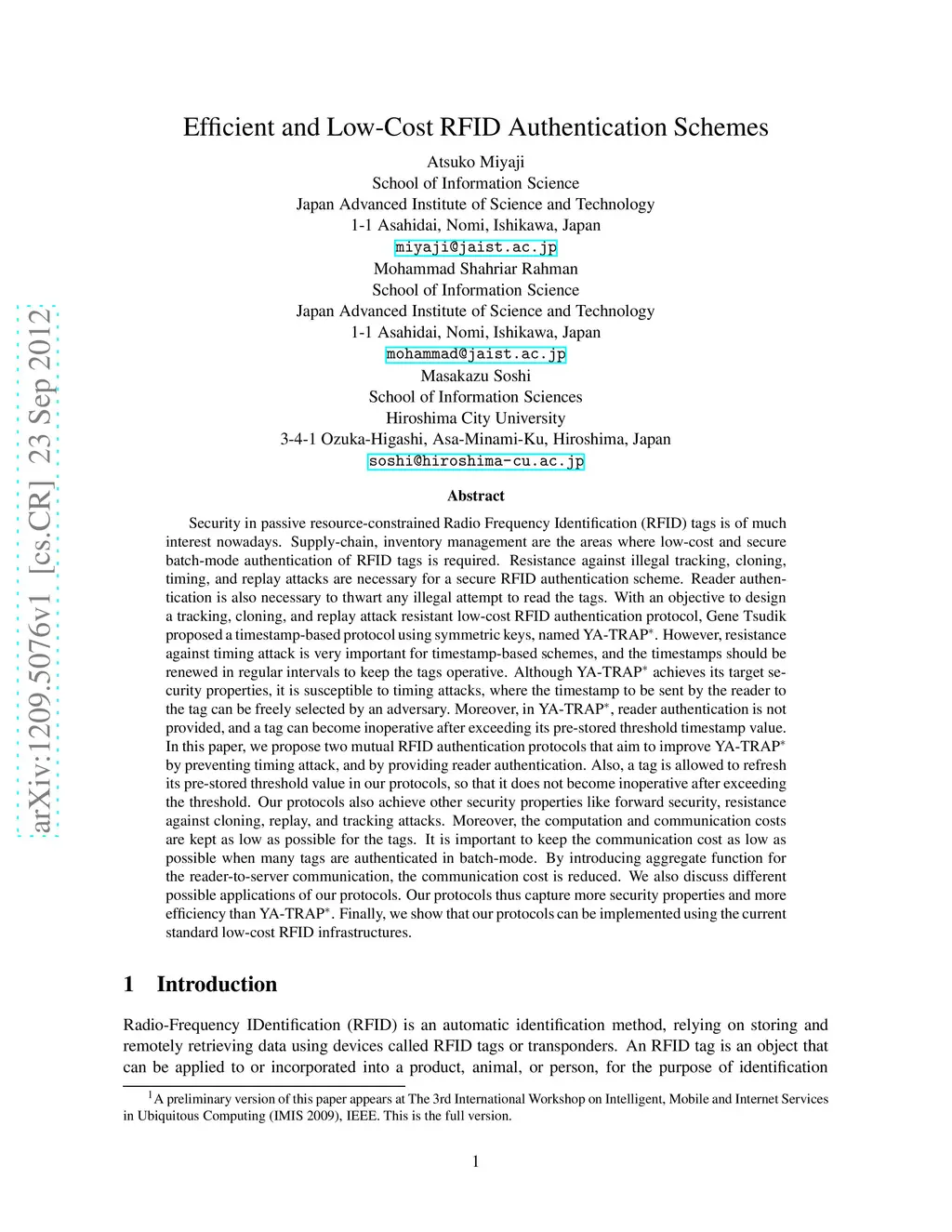 Security in passive resource-constrained Radio Frequency Identification (RFID) tags is of much interest nowadays. Resistance against illegal tracking, cloning, timing, and replay attacks are necessary for a secure RFID authentication scheme. Reader authentication is also necessary to thwart any illegal attempt to read the tags. With an objective to design a secure and low-cost RFID authentication protocol, Gene Tsudik proposed a timestamp-based protocol using symmetric keys, named YA-TRAP*. Although YA-TRAP* achieves its target security properties, it is susceptible to timing attacks, where the timestamp to be sent by the reader to the tag can be freely selected by an adversary. Moreover, in YA-TRAP*, reader authentication is not provided, and a tag can become inoperative after exceeding its pre-stored threshold timestamp value. In this paper, we propose two mutual RFID authentication protocols that aim to improve YA-TRAP* by preventing timing attack, and by providing reader authentication. Also, a tag is allowed to refresh its pre-stored threshold value in our protocols, so that it does not become inoperative after exceeding the threshold. Our protocols also achieve other security properties like forward security, resistance against cloning, replay, and tracking attacks. Moreover, the computation and communication costs are kept as low as possible for the tags. It is important to keep the communication cost as low as possible when many tags are authenticated in batch-mode. By introducing aggregate function for the reader-to-server communication, the communication cost is reduced. We also discuss different possible applications of our protocols. Our protocols thus capture more security properties and more efficiency than YA-TRAP*. Finally, we show that our protocols can be implemented using the current standard low-cost RFID infrastructures.