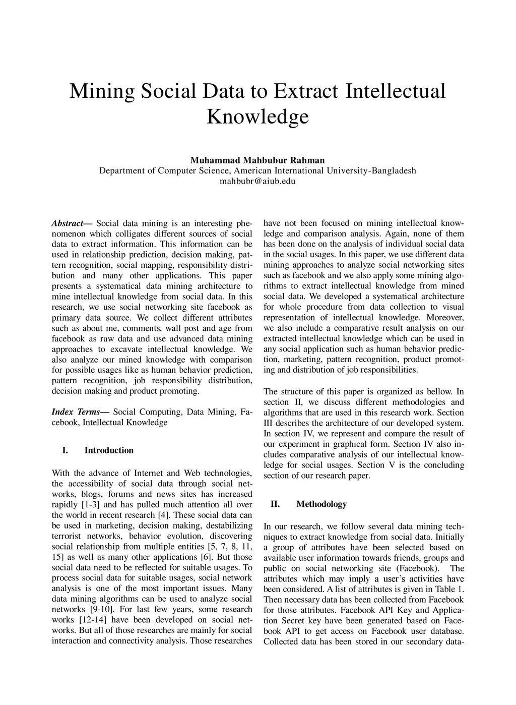 Social data mining is an interesting phe-nomenon which colligates different sources of social data to extract information. This information can be used in relationship prediction, decision making, pat-tern recognition, social mapping, responsibility distri-bution and many other applications. This paper presents a systematical data mining architecture to mine intellectual knowledge from social data. In this research, we use social networking site facebook as primary data source. We collect different attributes such as about me, comments, wall post and age from facebook as raw data and use advanced data mining approaches to excavate intellectual knowledge. We also analyze our mined knowledge with comparison for possible usages like as human behavior prediction, pattern recognition, job responsibility distribution, decision making and product promoting.