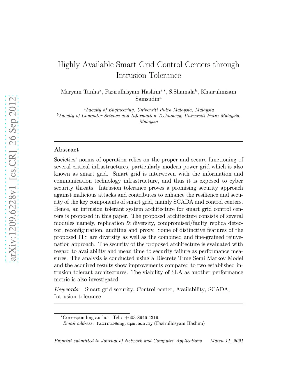 Highly Available Smart Grid Control Centers through Intrusion Tolerance
