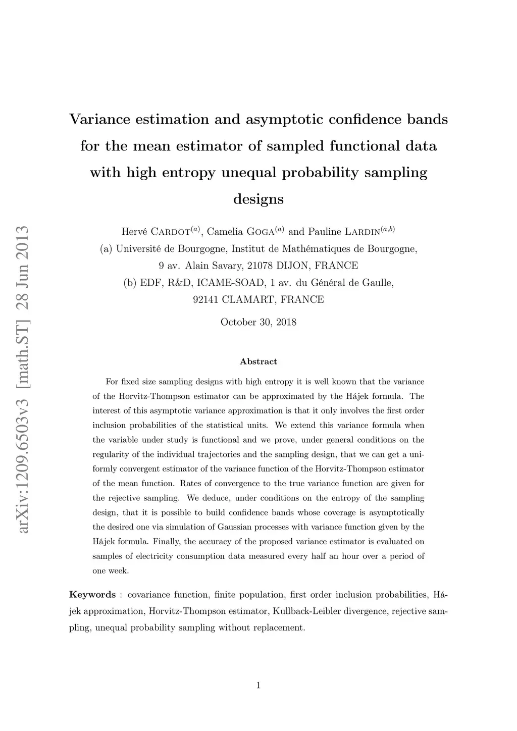 For fixed size sampling designs with high entropy it is well known that the variance of the Horvitz-Thompson estimator can be approximated by the H\ájek formula. The interest of this asymptotic variance approximation is that it only involves the first order inclusion probabilities of the statistical units. We extend this variance formula when the variable under study is functional and we prove, under general conditions on the regularity of the individual trajectories and the sampling design, that we can get a uniformly convergent estimator of the variance function of the Horvitz-Thompson estimator of the mean function. Rates of convergence to the true variance function are given for the rejective sampling. We deduce, under conditions on the entropy of the sampling design, that it is possible to build confidence bands whose coverage is asymptotically the desired one via simulation of Gaussian processes with variance function given by the H\ájek formula. Finally, the accuracy of the proposed variance estimator is evaluated on samples of electricity consumption data measured every half an hour over a period of one week.