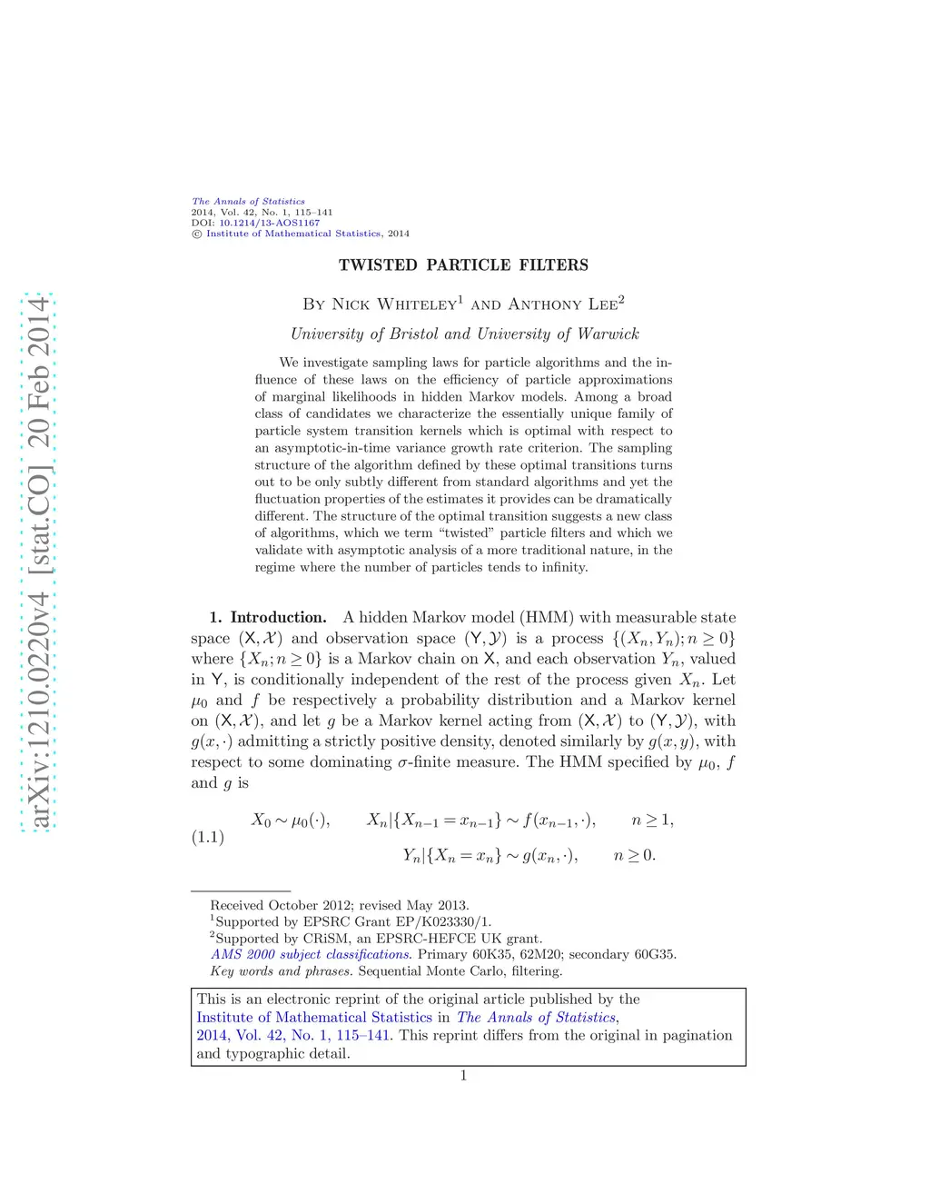We investigate alternative sampling laws for particle algorithms and the influence of these laws on the efficiency of particle approximations of marginal likelihoods in hidden Markov models. Amongst a broad class of candidates we characterize the essentially unique family of particle system transition kernels which is optimal with respect to an asymptotic-in-time variance growth rate criterion. The sampling structure of the algorithm defined by these optimal transitions turns out to be only quite subtly different from standard algorithms and yet the fluctuation properties of the estimates it provides are, in some ways, dramatically different. The structure of the optimal transition suggests a new class of algorithms, which we term "twisted" particle filters, and which we validate with asymptotic analysis of a more traditional nature, in the regime where the number of particles tends to infinity.