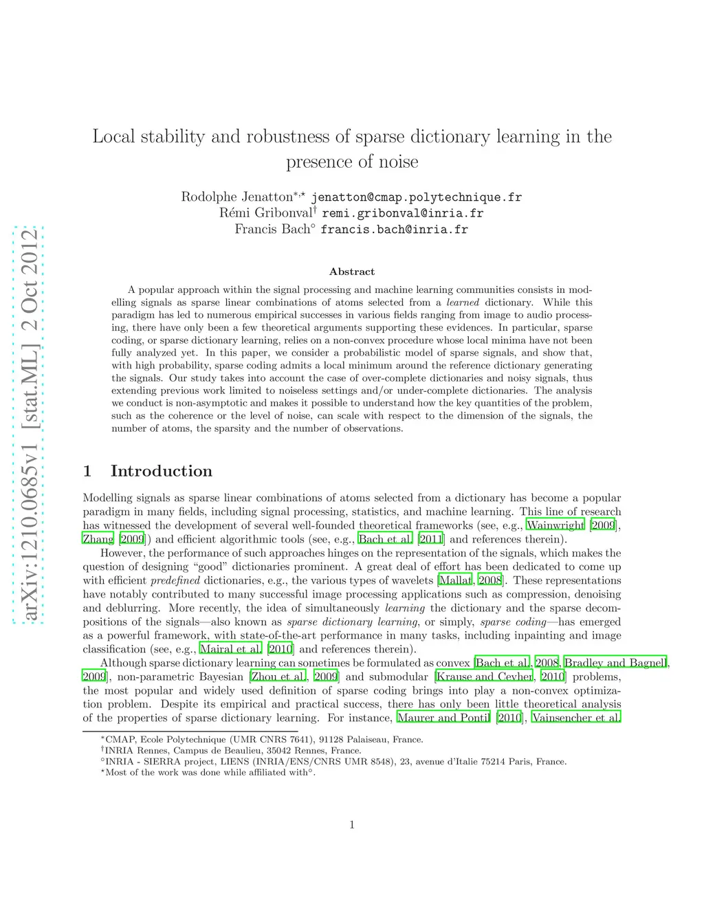 A popular approach within the signal processing and machine learning communities consists in modelling signals as sparse linear combinations of atoms selected from a learned dictionary. While this paradigm has led to numerous empirical successes in various fields ranging from image to audio processing, there have only been a few theoretical arguments supporting these evidences. In particular, sparse coding, or sparse dictionary learning, relies on a non-convex procedure whose local minima have not been fully analyzed yet. In this paper, we consider a probabilistic model of sparse signals, and show that, with high probability, sparse coding admits a local minimum around the reference dictionary generating the signals. Our study takes into account the case of over-complete dictionaries and noisy signals, thus extending previous work limited to noiseless settings and/or under-complete dictionaries. The analysis we conduct is non-asymptotic and makes it possible to understand how the key quantities of the problem, such as the coherence or the level of noise, can scale with respect to the dimension of the signals, the number of atoms, the sparsity and the number of observations.