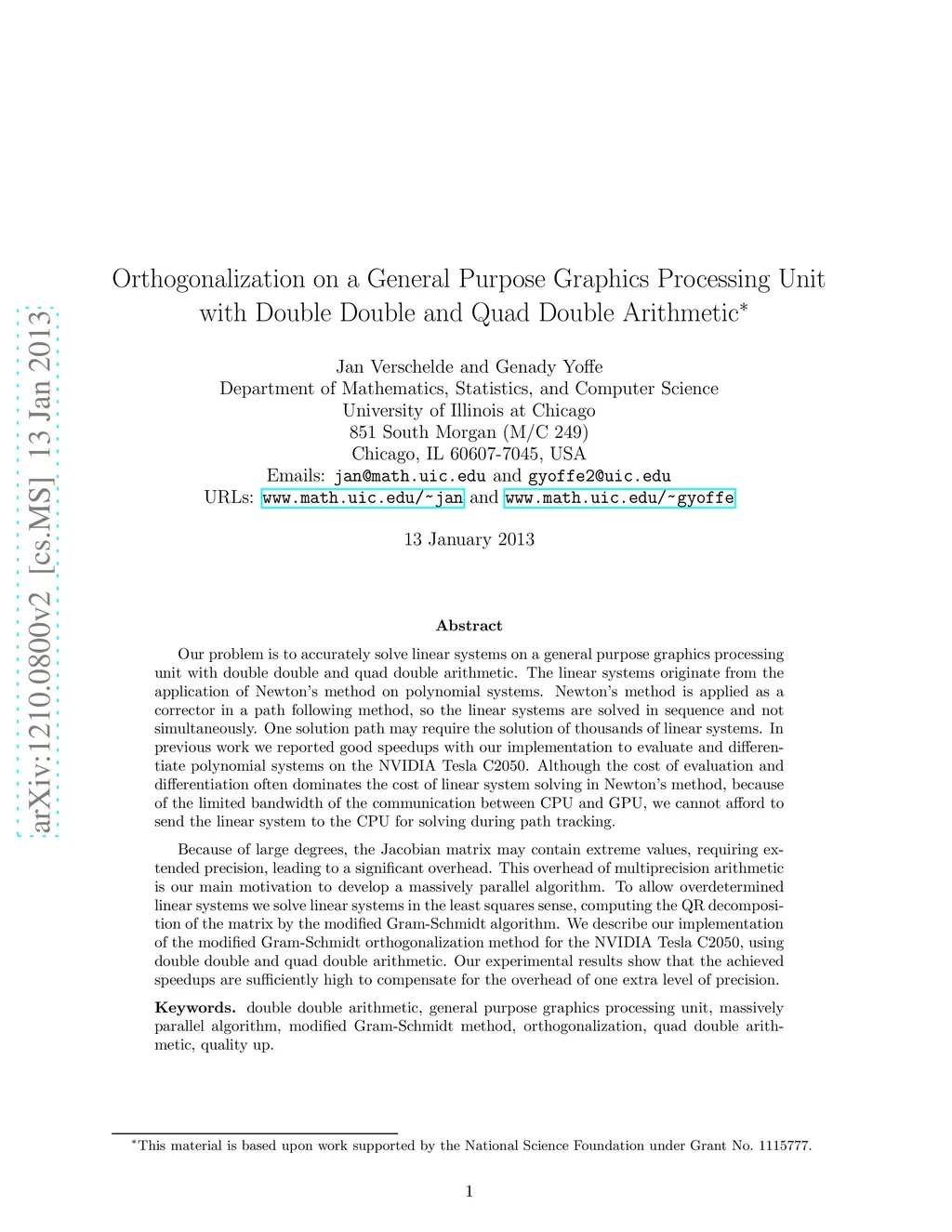 Our problem is to accurately solve linear systems on a general purpose graphics processing unit with double double and quad double arithmetic. The linear systems originate from the application of Newton's method on polynomial systems. Newton's method is applied as a corrector in a path following method, so the linear systems are solved in sequence and not simultaneously. One solution path may require the solution of thousands of linear systems. In previous work we reported good speedups with our implementation to evaluate and differentiate polynomial systems on the NVIDIA Tesla C2050. Although the cost of evaluation and differentiation often dominates the cost of linear system solving in Newton's method, because of the limited bandwidth of the communication between CPU and GPU, we cannot afford to send the linear system to the CPU for solving during path tracking. Because of large degrees, the Jacobian matrix may contain extreme values, requiring extended precision, leading to a significant overhead. This overhead of multiprecision arithmetic is our main motivation to develop a massively parallel algorithm. To allow overdetermined linear systems we solve linear systems in the least squares sense, computing the QR decomposition of the matrix by the modified Gram-Schmidt algorithm. We describe our implementation of the modified Gram-Schmidt orthogonalization method for the NVIDIA Tesla C2050, using double double and quad double arithmetic. Our experimental results show that the achieved speedups are sufficiently high to compensate for the overhead of one extra level of precision.