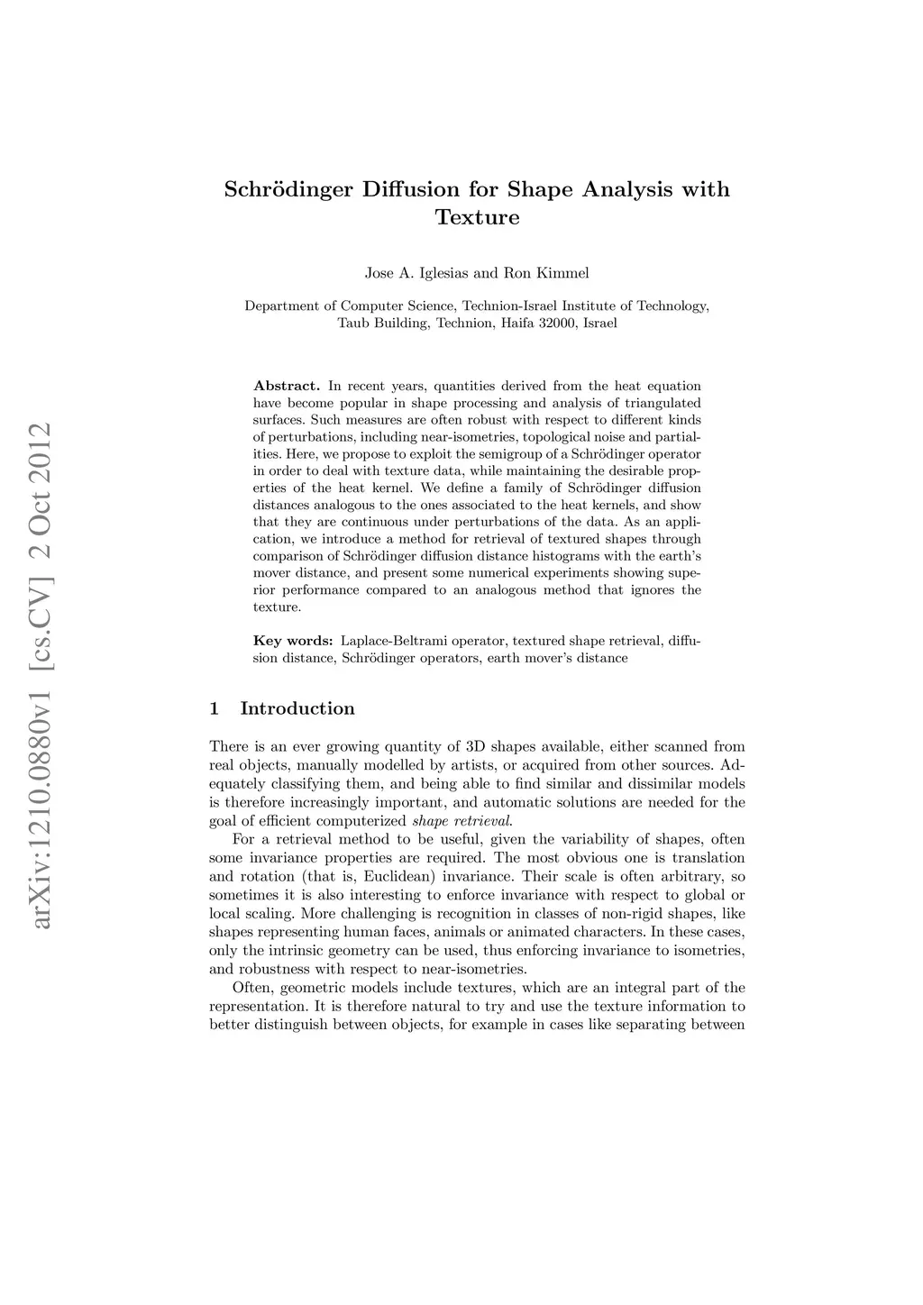 In recent years, quantities derived from the heat equation have become popular in shape processing and analysis of triangulated surfaces. Such measures are often robust with respect to different kinds of perturbations, including near-isometries, topological noise and partialities. Here, we propose to exploit the semigroup of a Schr\"{o}dinger operator in order to deal with texture data, while maintaining the desirable properties of the heat kernel. We define a family of Schr\"{o}dinger diffusion distances analogous to the ones associated to the heat kernels, and show that they are continuous under perturbations of the data. As an application, we introduce a method for retrieval of textured shapes through comparison of Schr\"{o}dinger diffusion distance histograms with the earth's mover distance, and present some numerical experiments showing superior performance compared to an analogous method that ignores the texture.