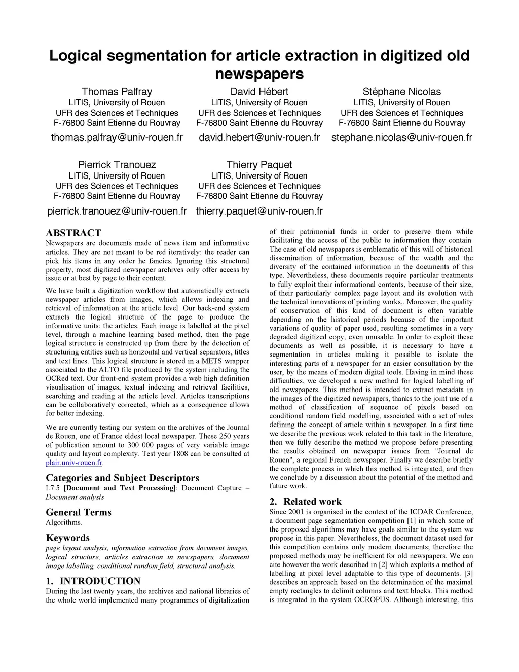 Newspapers are documents made of news item and informative articles. They are not meant to be red iteratively: the reader can pick his items in any order he fancies. Ignoring this structural property, most digitized newspaper archives only offer access by issue or at best by page to their content. We have built a digitization workflow that automatically extracts newspaper articles from images, which allows indexing and retrieval of information at the article level. Our back-end system extracts the logical structure of the page to produce the informative units: the articles. Each image is labelled at the pixel level, through a machine learning based method, then the page logical structure is constructed up from there by the detection of structuring entities such as horizontal and vertical separators, titles and text lines. This logical structure is stored in a METS wrapper associated to the ALTO file produced by the system including the OCRed text. Our front-end system provides a web high definition visualisation of images, textual indexing and retrieval facilities, searching and reading at the article level. Articles transcriptions can be collaboratively corrected, which as a consequence allows for better indexing. We are currently testing our system on the archives of the Journal de Rouen, one of France eldest local newspaper. These 250 years of publication amount to 300 000 pages of very variable image quality and layout complexity. Test year 1808 can be consulted at plair.univ-rouen.fr.