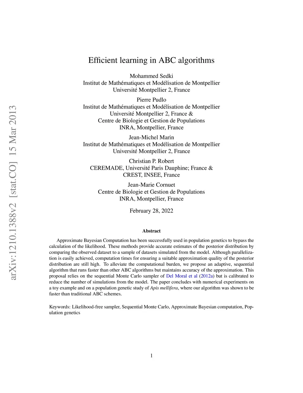 Approximate Bayesian Computation has been successfully used in population genetics to bypass the calculation of the likelihood. These methods provide accurate estimates of the posterior distribution by comparing the observed dataset to a sample of datasets simulated from the model. Although parallelization is easily achieved, computation times for ensuring a suitable approximation quality of the posterior distribution are still high. To alleviate the computational burden, we propose an adaptive, sequential algorithm that runs faster than other ABC algorithms but maintains accuracy of the approximation. This proposal relies on the sequential Monte Carlo sampler of Del Moral et al. (2012) but is calibrated to reduce the number of simulations from the model. The paper concludes with numerical experiments on a toy example and on a population genetic study of Apis mellifera, where our algorithm was shown to be faster than traditional ABC schemes.