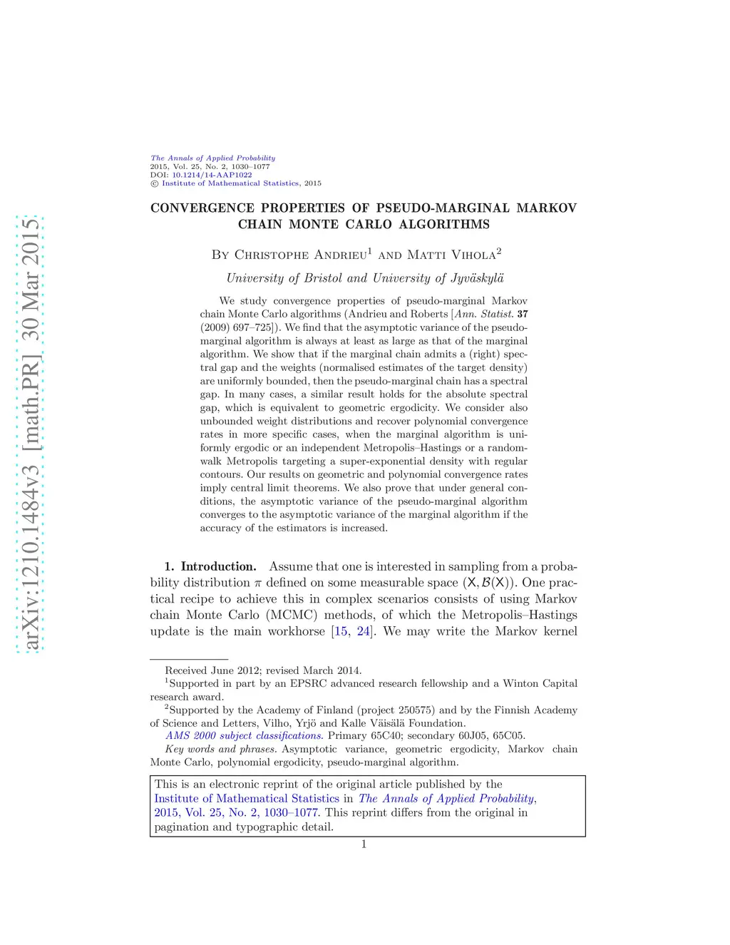 We study convergence properties of pseudo-marginal Markov chain Monte Carlo algorithms (Andrieu and Roberts [Ann. Statist. 37 (2009) 697-725]). We find that the asymptotic variance of the pseudo-marginal algorithm is always at least as large as that of the marginal algorithm. We show that if the marginal chain admits a (right) spectral gap and the weights (normalised estimates of the target density) are uniformly bounded, then the pseudo-marginal chain has a spectral gap. In many cases, a similar result holds for the absolute spectral gap, which is equivalent to geometric ergodicity. We consider also unbounded weight distributions and recover polynomial convergence rates in more specific cases, when the marginal algorithm is uniformly ergodic or an independent Metropolis-Hastings or a random-walk Metropolis targeting a super-exponential density with regular contours. Our results on geometric and polynomial convergence rates imply central limit theorems. We also prove that under general conditions, the asymptotic variance of the pseudo-marginal algorithm converges to the asymptotic variance of the marginal algorithm if the accuracy of the estimators is increased.