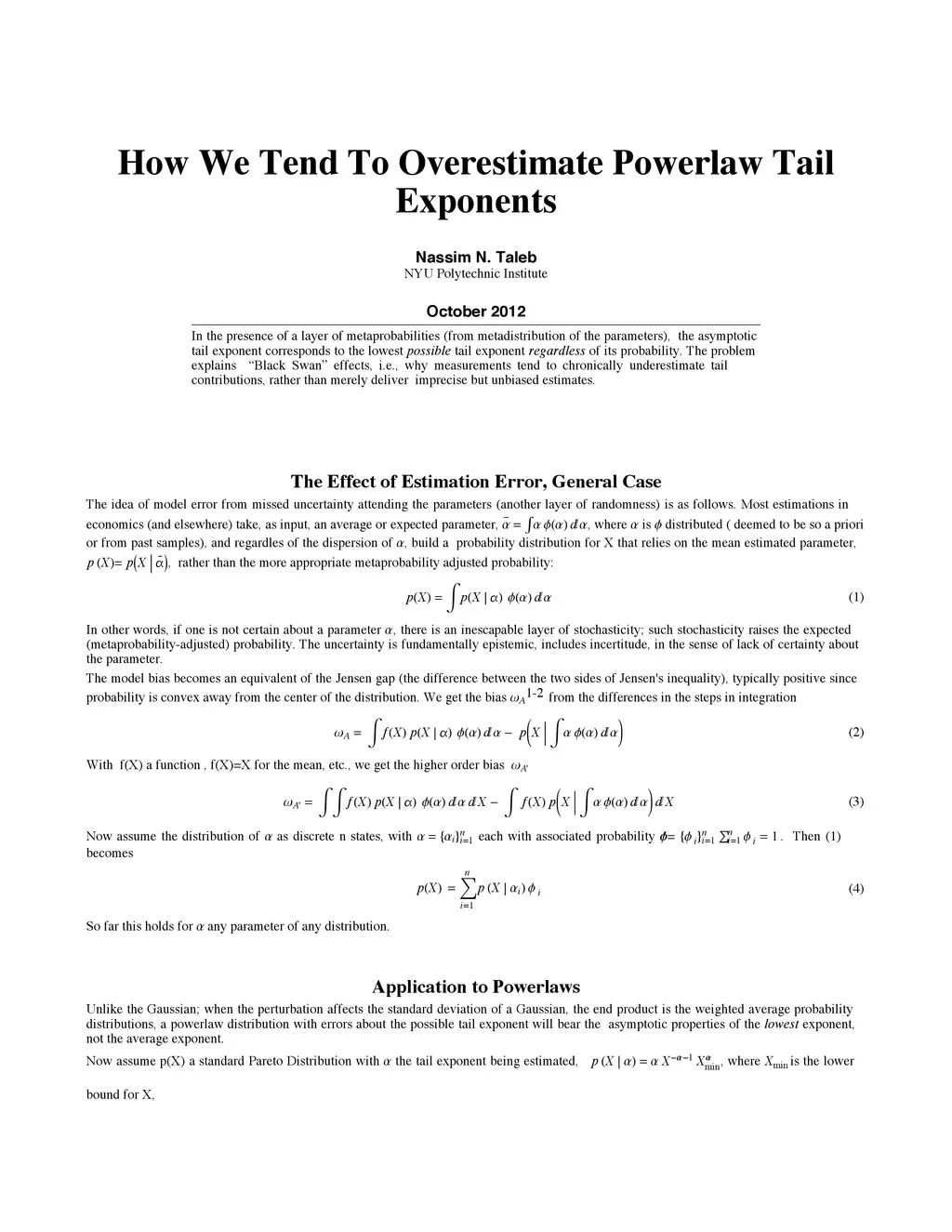 In the presence of a layer of metaprobabilities (from uncertainty concerning the parameters), the asymptotic tail exponent corresponds to the lowest possible tail exponent regardless of its probability. The problem explains "Black Swan" effects, i.e., why measurements tend to chronically underestimate tail contributions, rather than merely deliver imprecise but unbiased estimates.