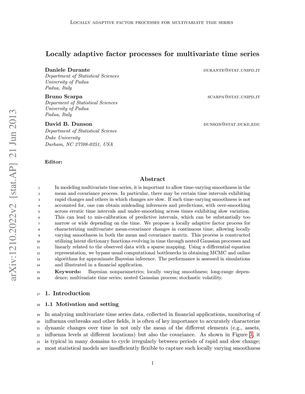 In modeling multivariate time series, it is important to allow time-varying smoothness in the mean and covariance process. In particular, there may be certain time intervals exhibiting rapid changes and others in which changes are slow. If such time-varying smoothness is not accounted for, one can obtain misleading inferences and predictions, with over-smoothing across erratic time intervals and under-smoothing across times exhibiting slow variation. This can lead to mis-calibration of predictive intervals, which can be substantially too narrow or wide depending on the time. We propose a locally adaptive factor process for characterizing multivariate mean-covariance changes in continuous time, allowing locally varying smoothness in both the mean and covariance matrix. This process is constructed utilizing latent dictionary functions evolving in time through nested Gaussian processes and linearly related to the observed data with a sparse mapping. Using a differential equation representation, we bypass usual computational bottlenecks in obtaining MCMC and online algorithms for approximate Bayesian inference. The performance is assessed in simulations and illustrated in a financial application.