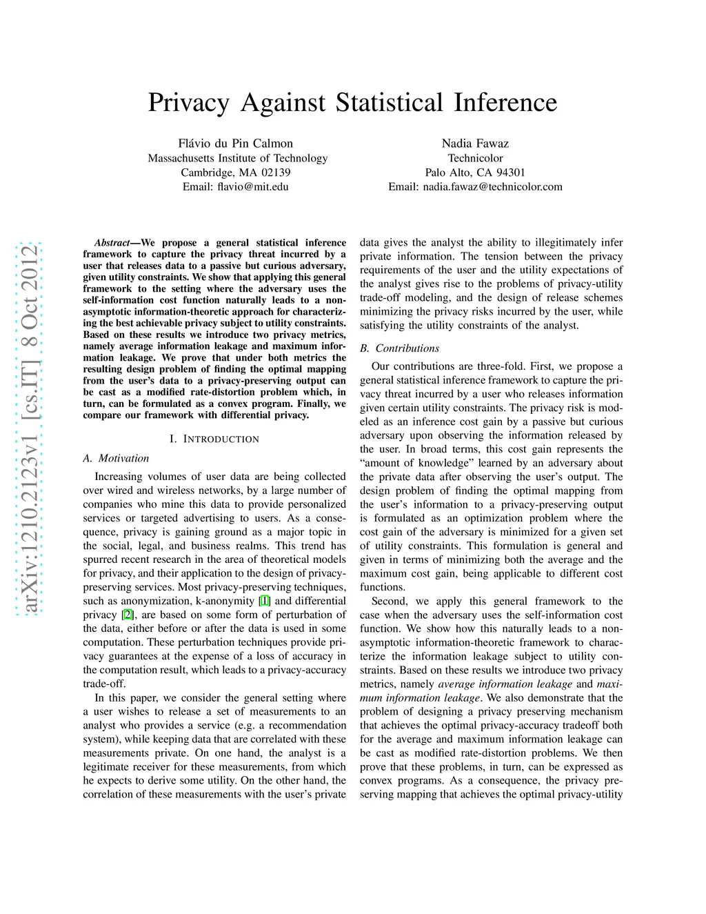 We propose a general statistical inference framework to capture the privacy threat incurred by a user that releases data to a passive but curious adversary, given utility constraints. We show that applying this general framework to the setting where the adversary uses the self-information cost function naturally leads to a non-asymptotic information-theoretic approach for characterizing the best achievable privacy subject to utility constraints. Based on these results we introduce two privacy metrics, namely average information leakage and maximum information leakage. We prove that under both metrics the resulting design problem of finding the optimal mapping from the user's data to a privacy-preserving output can be cast as a modified rate-distortion problem which, in turn, can be formulated as a convex program. Finally, we compare our framework with differential privacy.